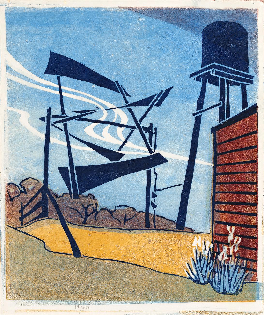 Coppel, S., Linocuts of the Machine Age: Claude Flight and the Grosvenor School, Scolar Press, Aldershot, England, in association with the National Gallery of Australia, Canberra, 1995, cat. DB11, pp. 154 –155 (illus., another example, as ‘Bush Wind Mill, c.1930’)