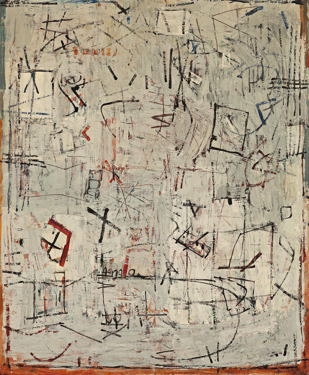 Yvonne Audette: Salon Exhibition, Mossgreen Gallery, Melbourne, 8 September – 3 October 2009 (label attached verso, as ‘Calligraphy on an Ancient Tablet, No. 2, 1960’)