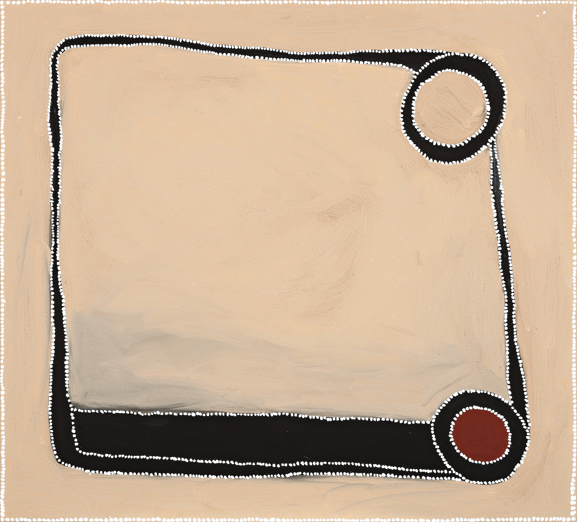 Camel Gap, known as Gernawarliyan to the local Gija people is located to the south-east of Bedford Downs adjacent to Marty’s bore. It is a site in the artist's mother's traditional lands where the ancestral goanna, Garndoowoolany camped in the Dreaming (Ngarranggarni). The site is indicated in the painting by the roundels. It was here that Garndoowoolany called out to the dingo Marranyji who was standing on a hill. Marranyji became stuck and was transformed into a rock. The modern name of the site dates back to the time when Afghani traders took their camels through the eastern Kimberley to the port of Wyndham. The rock itself, situated in the red ochre corner in the painting, is said to be in the shape of a camel.