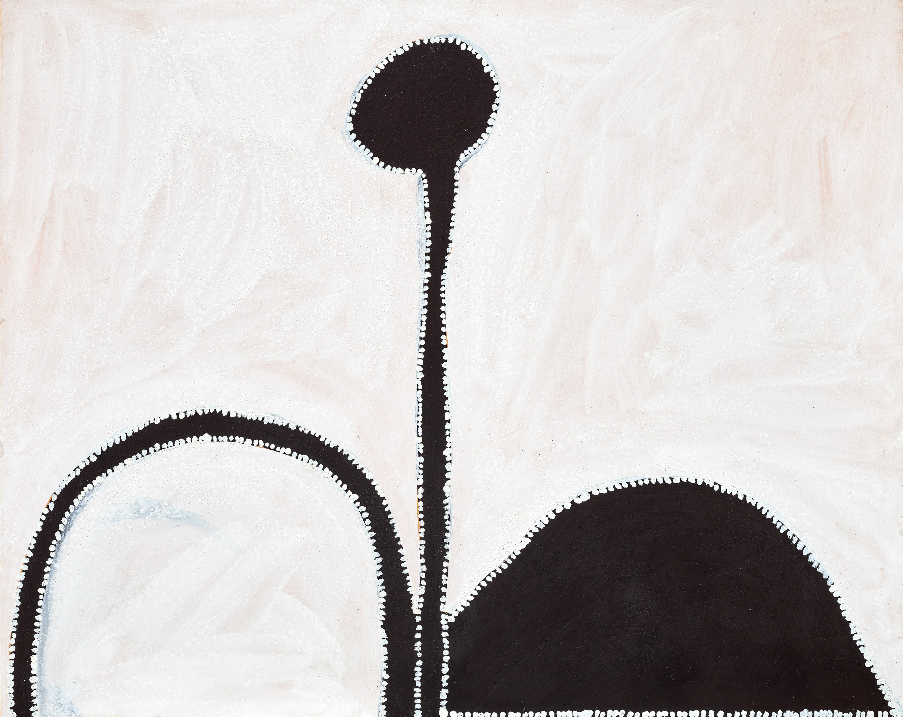 Drawing from two very different sources of knowledge, and painting with a deep sense of history and cultural responsibility, Paddy Bedford mapped the rich history of the east Kimberley using stories from his father’s, mother’s and uncle’s country. Within his canvases, historical events together with the more mundane stories about daily life on cattle stations co-exist with profound and lyrical understanding of the land and its creation stories. Bedford explored the important stories from its past whilst painting the bones of the landscape with the waterholes, stockyards and roads that he traversed throughout his life. Painted in 2001, Camel Gap, documents an evolution in the artist’s painting style, moving beyond the more familiar ochre representations of country produced by earlier East Kimberley artists, and predicting his further innovative changes in palette and technique.