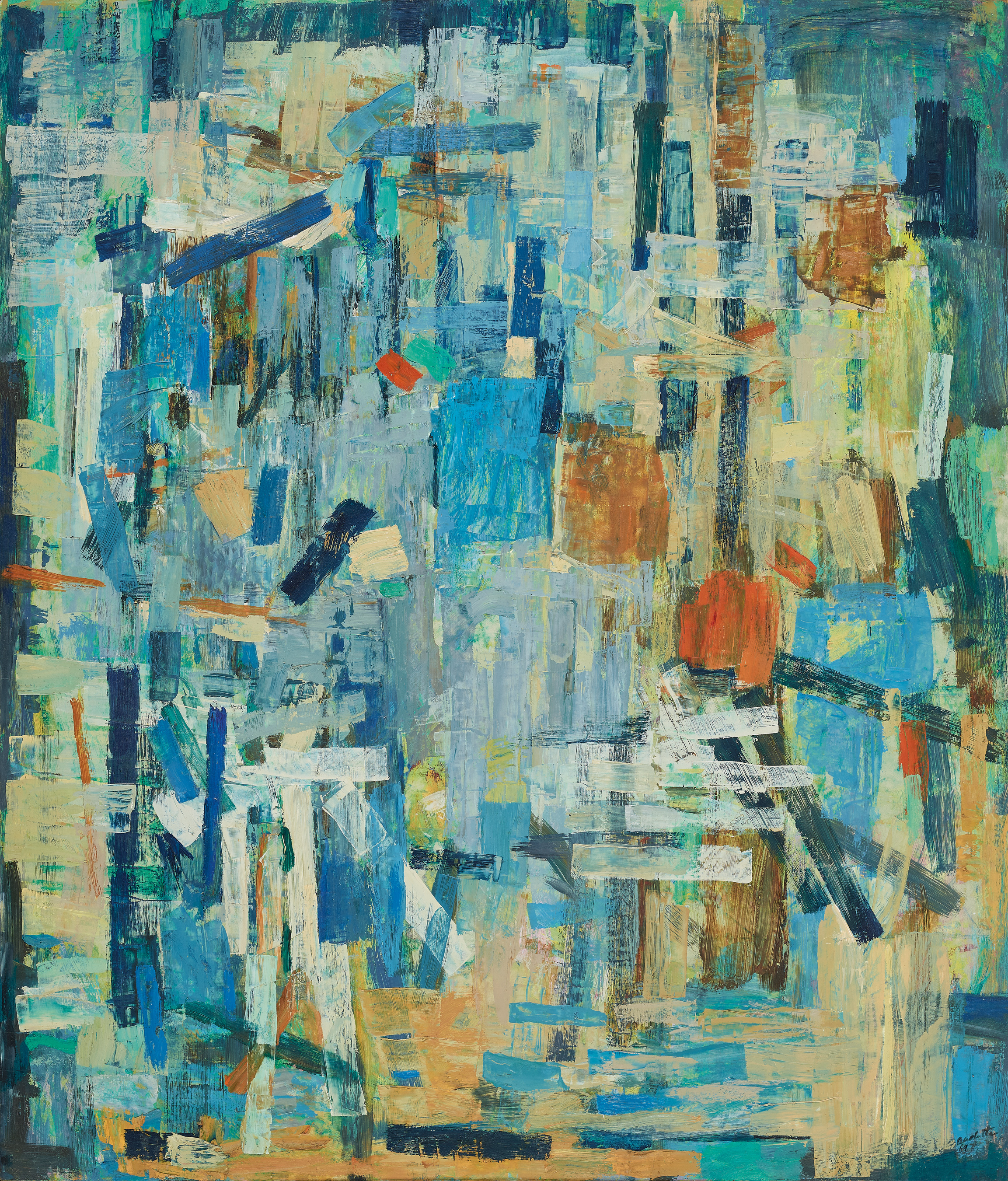 These lyrical abstract compositions reflected the multilayered histories Audette encountered in Europe: ‘When I went to Europe in the mid-50s … my work responded to the layering of society itself – the remnants of murals on walls, the frescoes, the whole antiquity of the civilisation.’3 Some marks are sharp and clear, in the uppermost stratum of paint, while others are wiped clean away before being further obscured by super-imposed shapes and competing hues. In this swarming surface, one can discern the bright tones of Sydney harbour, particularly in comparison to Audette’s dark Italian works. Cantata #17 plays on the idea of musical harmony and invention, as hinted by the title of this series. Drawing inspiration from the ’mystical joy’ the artist found in the polyphonic genius of J.S. Bach’s compositions, this series explores variations on a theme, weaving together independent melodies and harmonies of colour.4
