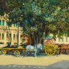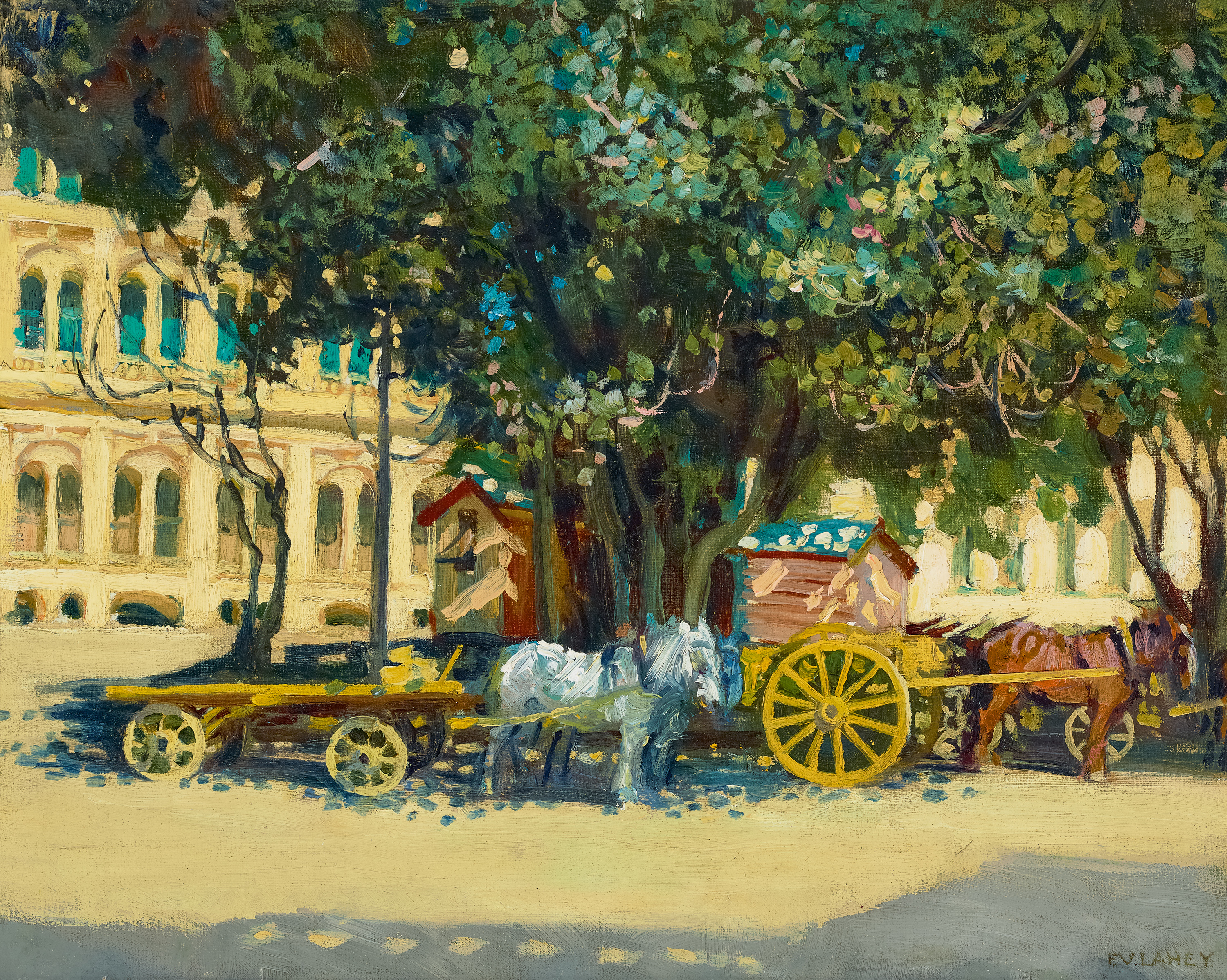 As such, (Carts in Eagle Street) marks a renewal of practice for the artist. During the Great War, she based herself in London, and studied further in England and France. On her return, Lahey was peripatetic for some years with periods in Hobart, Melbourne and Sydney before finally re-settling in Brisbane in 1929. She would return to painting images of the rapidly changing city, particularly for a solo exhibition in 1932 (see lot. 7), but the number of surviving pre-war works that have survived is few. Inevitably, the drowsy ambience of this scene is long gone, overtaken by the increasing use of motor-driven transport which eventually supplanted the ranks of horse-drawn carts. Today, only the heritage-listed Banyan tree and its White Fig companions remain.