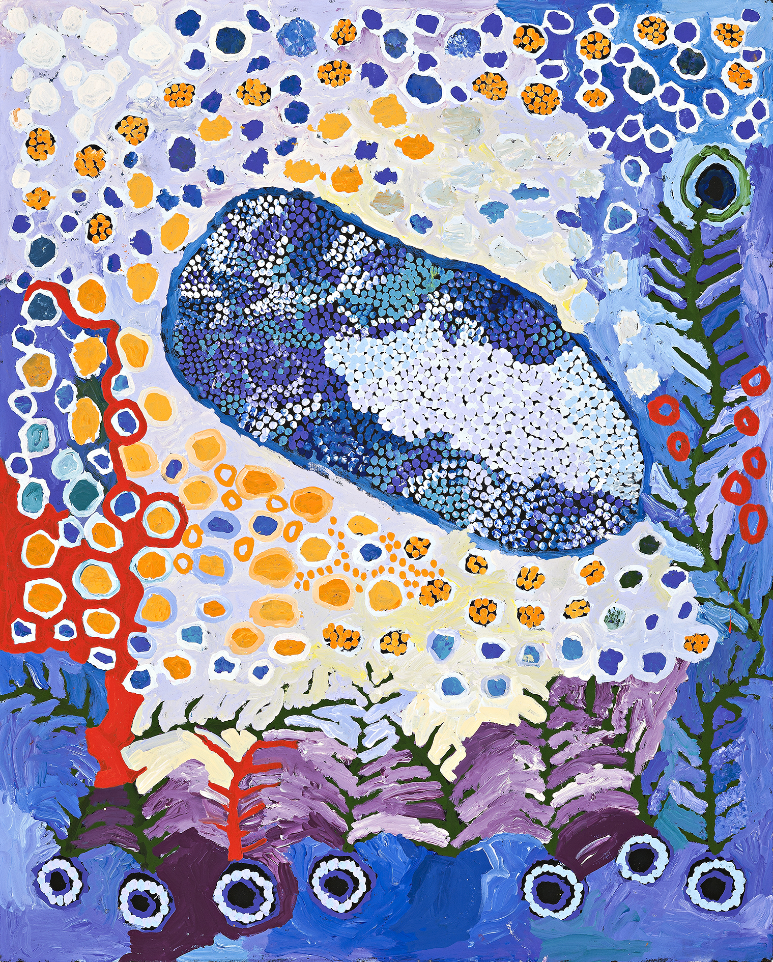 This work is accompanied by a certificate from Tjungu Palya Artists which states: ‘This is kapi tjukula (the deep rockholes) and karu (the creek lines) in my country Cave Hill. This is a sacred place for the Seven Sisters Dreaming. Minyma tjuta (the sisters) are sitting inside the cave, hiding from the cheeky man, Wati Nyiru. This country is form my father.’