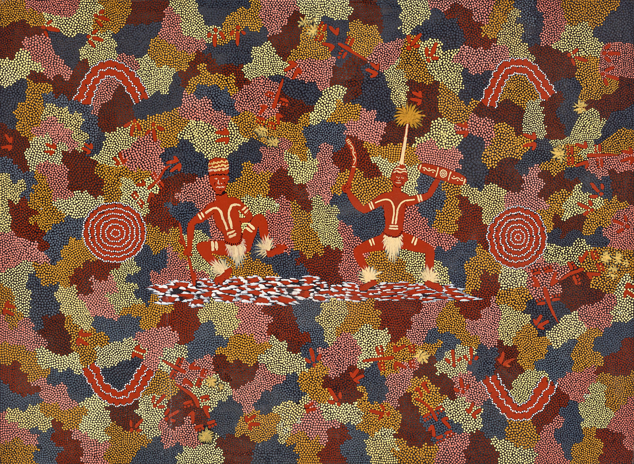 Clifford Possum Tjapaltjarri was an innovative painter who experimented with combinations of traditional and Western European visual perspectives, as in this deceptively literal painting. The work depicts two men belonging to the Tjungurrayi and Tjapaltjarri kinship groups – a father and son relationship – performing ritual dances. The figures are drawn naturalistically, wearing ceremonial regalia and body paint. The grey and red flecked area represents the dirt kick up by their feet as they dance. The men are also represented symbolically by the U-shapes adjacent to the roundels to either side of the main figures. Tracks of the ancestral Bush Turkey and Kangaroo course through the picture in a rhythm that mimics the choreography of the dance. Given the auto-biographical nature of much of Tjapaltjarri’s painting, the two figures possibly represent him with his father Jajirdi Tjungurrayi or his adoptive father, Jajirdi’s younger brother Gwoya Tjungurrayi (c.1895 – 1965).1 Gwoya is known popularly by the nickname One Pound Jimmy because he was the first Aboriginal person to be featured on an Australian stamp in 1950.