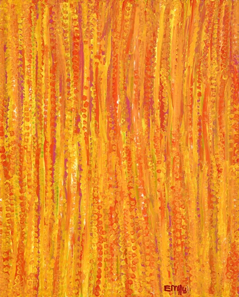 This work is accompanied by a certificate of authenticity from Delmore Gallery, via Alice Springs which states: ‘On this canvas, the artist’s choice of a rich yellow represents the most important plant in her custodianship, namely the “Anooralya”, a hardy and fertile plant that provides both a tuber vegetable and a seed-bearing flower called “kame” – Emily’s tribal name. Other colours reflect the time of the season when particular bush flowers flourish. These flowers contain seeds that are collected to make types of seed cake, damper, medicines and love potions. Other colours symbolises the ‘ndorkwa’, or bush plum, when unripe. The dots being placed in lineal fashion and placed amongst lines, connects with the practise of anointing the body with lineal designs during ceremony, thus adding another dimension of celebration in the execution of this painting.