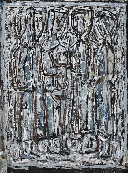 Comprising a dense series of linear strokes of black, grey, brown and white paint, the overall surface pattern of Christmas, 1961 recedes after a time and the subject emerges – five figures standing closely together, the central one holding a baby. The presence of the baby and the title of the work identify this as a nativity scene with the figures representing the Holy Family, Mary in the centre with her head slightly bowed, looking down at the baby in her arms, Joseph and the three Wise Men. There are clues to the diverse influences that shaped Fairweather’s art here, from Cubism, to Chinese calligraphy and the art of Indigenous Australia, but above all else works such as this exemplify the unique nature of his visual language and the singular contribution he made to the development of twentieth century Australian art.