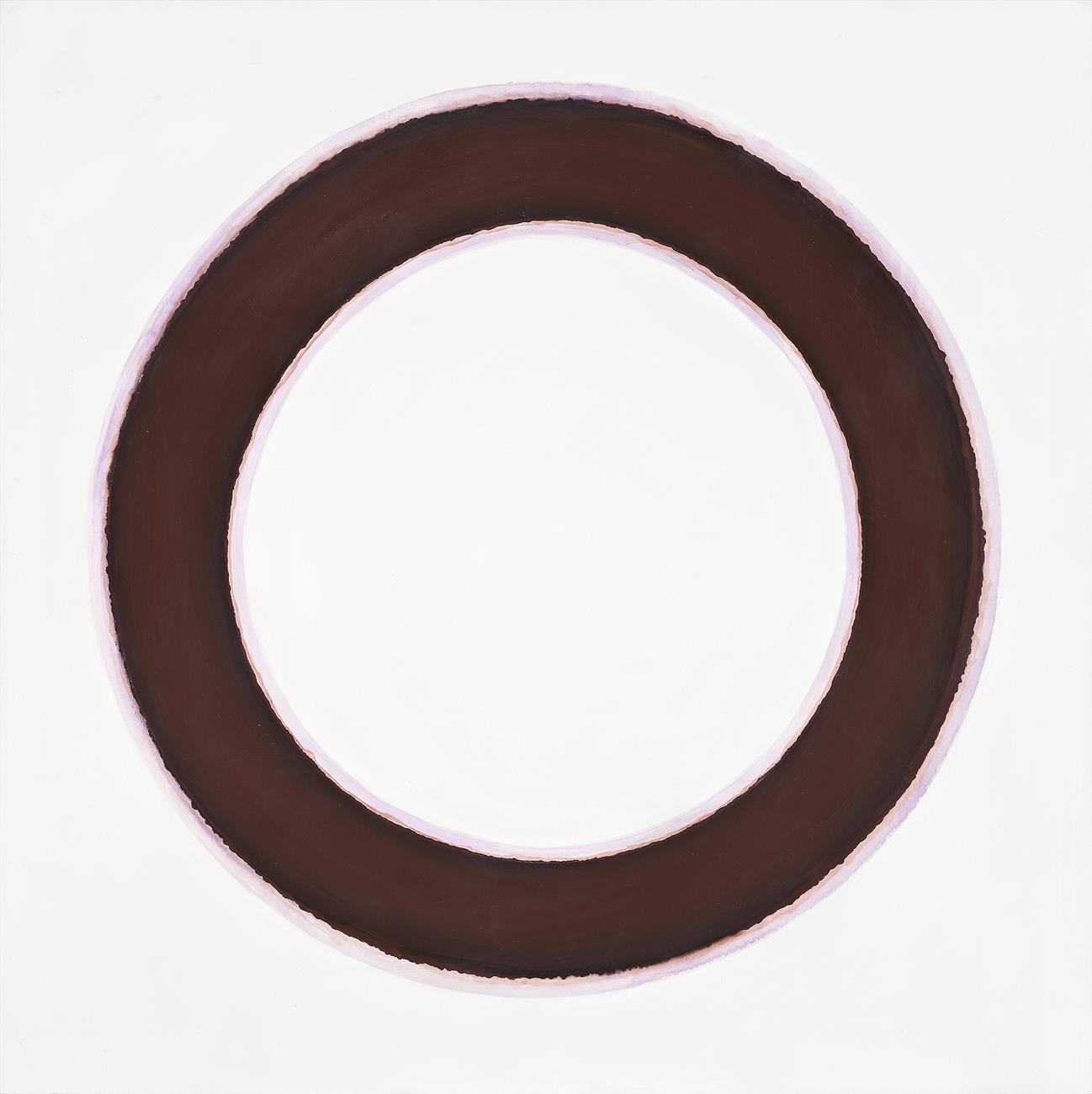 Despite its simple geometric composition, Circle Movement is not an example of modernist hard-edge abstraction, incorporating a delicate pink halo along the innermost and outermost edges of its central motif. The softly graduated edges of this pink interposition may recall, for contemporary audiences, the optical effects of Ugo Rondinone’s vibrant circle paintings. However, in Circle Movement, the emphasis is not on the central black ring, but instead on its relationship with the perfect square of its canvas support. This is a spatial interest he shared with abstractionists in New York, particularly Jasper Johns with his iconic target paintings of the late 1950s and Kenneth Noland’s circle paintings of the 1960s. The tension between these geometric figures is reinforced in Rapotec’s composition through a strong tonal contrast between the black motif and its clean, white support. Through the harmonious relationship between the positive and negative elements of its composition, Circle Movement encourages quiet reflection and meditation.