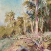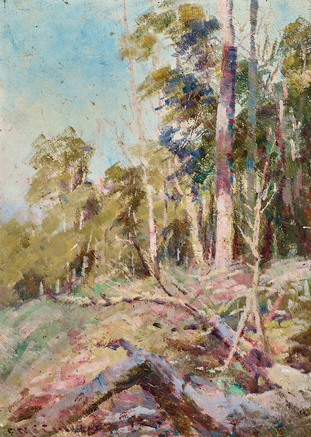 Significantly, McCubbin named their family Macedon home 'Fontainebleau' after the forest in France, neighbouring the village of Barbizon and its school of plein air painters, especially McCubbin's favourite, Corot. Devoting himself to painting in the open air, he even dug a trench in the ground so that he could reach the canvas tops of The Pioneer. Now in the middle years of his art, his style became broader and vision fresher in response to painting out-of-doors directly from the motif, as readily seen in The Clearing, Mount Macedon, c.1904. The smoothly painted tight style of earlier years gave way to the freer, textured brushstroke and palette knife. These transitions are clearly visible in the comparison of Macedon landscapes such as A Bush Scene 1903, in the collection of the Art Gallery of Ballarat, and two works close to the painting on offer - The Hillside, Macedon 1904, private collection, Melbourne, and Sunny Glade.5 In these later paintings the brushstrokes are applied with such verve that they seem to dance in spontaneous response to the scene. The focus of attention had now moved from the figure to the enchanting play of light, as in Sylvan Glade, Macedon 1906, in the Bendigo Art Gallery. In radiant sunlight or in shade, each of these paintings captures the characteristic qualities of his beloved bush at Mount Macedon, one of his most fruitful paintings grounds.