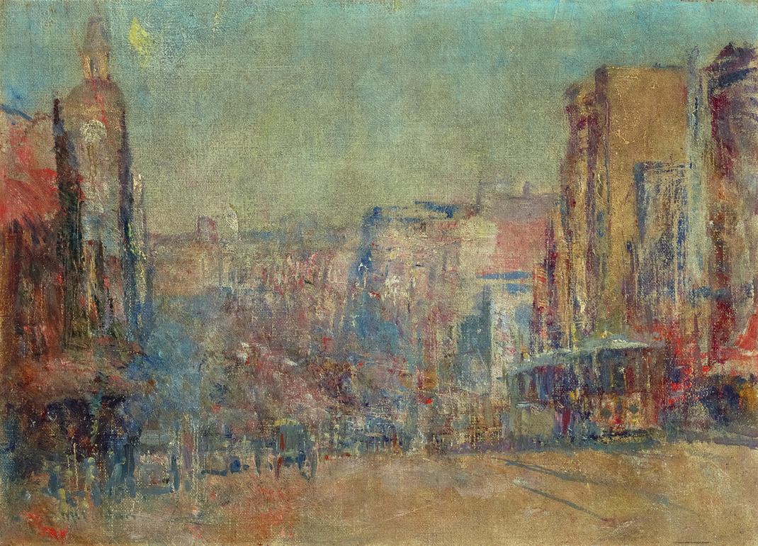 In 2009, the National Gallery of Australia exhibition, McCubbin: Last Impressions 1907–17, showcased the work produced by Frederick McCubbin during the final eleven years of his life. Curated by Anne Gray, the exhibition featured three Collins Street sketches all painted around 1915 on 10 x 12-inch canvas board. Notably, this group of smaller Melbourne cityscapes – which included the nearby Flinders Street subjects – were the most abstract in the exhibition.