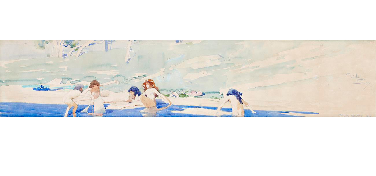 Streeton spent much of the summer of 1896 on the Hawkesbury River. In November he visited Melbourne to present his Sydney Sunshine Exhibition. The mighty painting ‘The Purple Noon’s Transparent Might’, 1896 was chief among the exhibited works, the first Streeton to be acquired by the National Gallery of Victoria that same year. The Hawkesbury River, 1896 and At Coogee, 1895 (both also in the collection of the National Gallery of Victoria) were similarly prominent. Critical response was justly generous, the writer for The Sun referring to Streeton’s colour as ‘glowing and transparent’, ‘the ‘open-air feeling’ of his paintings, and describing his sky as ‘a miracle of translucency’.4 While the seemingly unique A Colour Study (Children Bathing on the ForeShore), 1896 has not been identified with any in the exhibition catalogue, each word of the critic’s praise is applicable to our watercolour. By their very nature, watercolours are translucent, and the beguiling eccentricity of its elongated format echoes Streeton’s best of this time. At Coogee, which is also known as The Long Wave, Coogee, adopts a narrow format that captures ‘perfectly the long rolling surf as it breaks on the shoreline…’.5 In A Colour Study, the very long horizontal format encapsulates the lassitude of summer. An ideal setting for a sybaritic moment, it is redolent with the sensuous feel of warm sun, relaxed and carefree as the summer holidays of childhood.