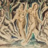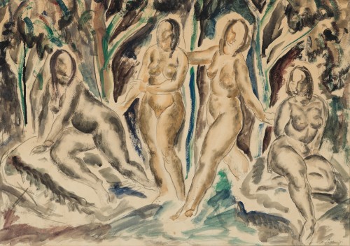 Composition, 1937 comes from the time Russell Drysdale was at the George Bell Bourke Street school where the achievements of Paul Cézanne were much admired. Thus, not surprisingly perhaps, the work displays Drysdale’s then considerable interest in the French master, reproductions of whose work he had seen at Gino Nibbi’s Leonardo Art Shop. Fellow student Geoff Jones recalled Drysdale ‘coming into the studio one day ‘full of excitement. He’d seen more Cézanne prints at Nibbi’s of such good quality you could see the paint surface.’1 It was a period of intense learning, as Drysdale later remarked, ‘Every influence around the place flooded me, and I seized it.’2 This lively influence of Cézanne on the early work of Drysdale is seen at its best in Composition 1937. While present in other watercolour drawings of the time such as The Card Players, 1935/37 and Stacking Wood, Heidelberg, 1937, Composition has a special grandeur about it. Recalling in subject and composition the great Bathers paintings of Cézanne, Drysdale’s female forms are likewise pleasingly rotund. Moreover, the vibrancy of the composition is achieved by a similar interplay between dynamic diagonals and the vivacity of the lights and darks across the picture plane. Frieze-like, it has a certain classical, monumental quality which one associates with grand large-sized compositions or murals. This same quality can be found in other works of 1937, including the pen, ink and water colour Sketch for Tempera Composition and the oil painting Men Mixing Concrete, both of which were included in the Drysdale retrospective exhibition at the Art Gallery of New South Wales in 1960.