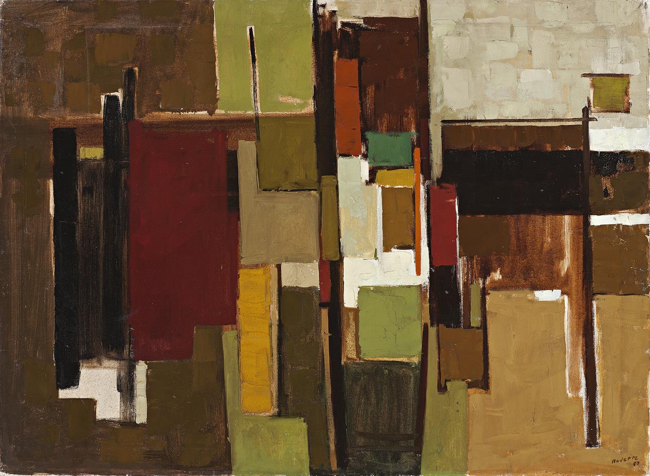 Audette left New York in May 1955 and after travelling in Europe, arrived in Italy where she established a studio in Florence.3 Welcomed into a community of successful practising artists including Arnaldo Pomodoro and Lucio Fontana and stimulated by their example, she worked hard, drawing on her experiences and range of creative influences to develop a mature abstract style. While Audette’s art has continued to evolve throughout her career, it is characterised by the textural layering of line and form, dextrous mark-making and a lyrical use of colour, a unique amalgam of contemporary local and international influences, which make it distinctive within twentieth-century Australian art. Painted in a range of earthy browns, blacks and greens that evoke the landscape, Composizione, 1959 comprises a series of variously scaled squares and rectilinear forms combined to create a carefully balanced central structure. The application of the paint in short staccato brushstrokes that echo the geometric components of the painting, enlivens the surface, adding to a sensation of movement within the overall pictorial equilibrium. In 1959 Audette travelled to Turkey and the Middle East, to France where she met the abstract artist Maria Elaina Vieira da Silva, and then to America where the scale and vitality of the New York art scene both confirmed and reinvigorated her direction to pursue painting as ‘a means to grasp the invisible, the mysterious logic of things’.4 As she later wrote, ‘I wish to substitute the more obvious visual associations for the more tenuous processes which have the power to awaken an inner vision. My imagery rests just below the horizon of recognition’.5