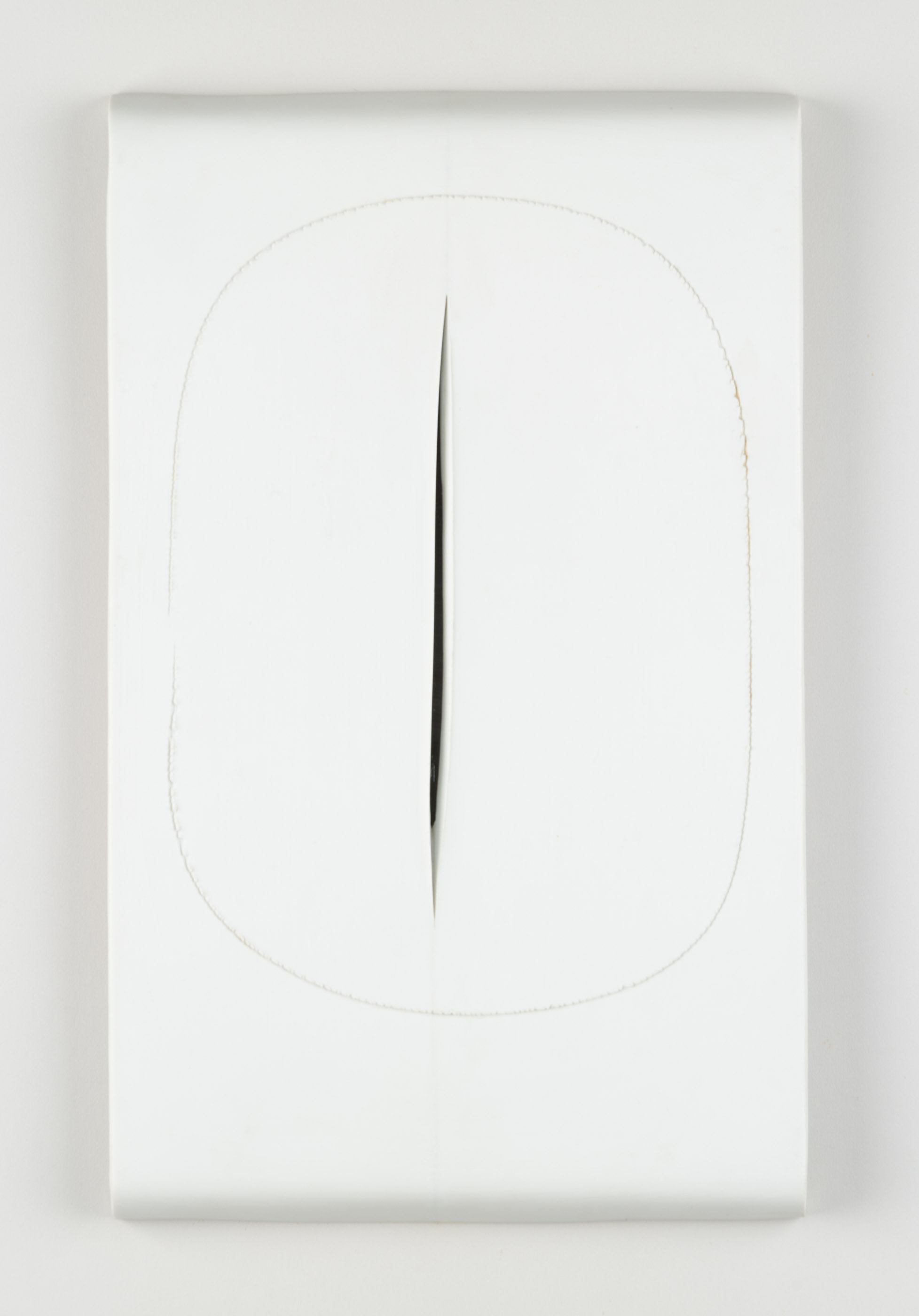 signed and numbered on Ars Porcellana – Rosenthal Relief Reihe ceramic label attached verso: l.Fontana / 33/75 Marlborough Gallery New York / London / Roma ceramic label attached verso