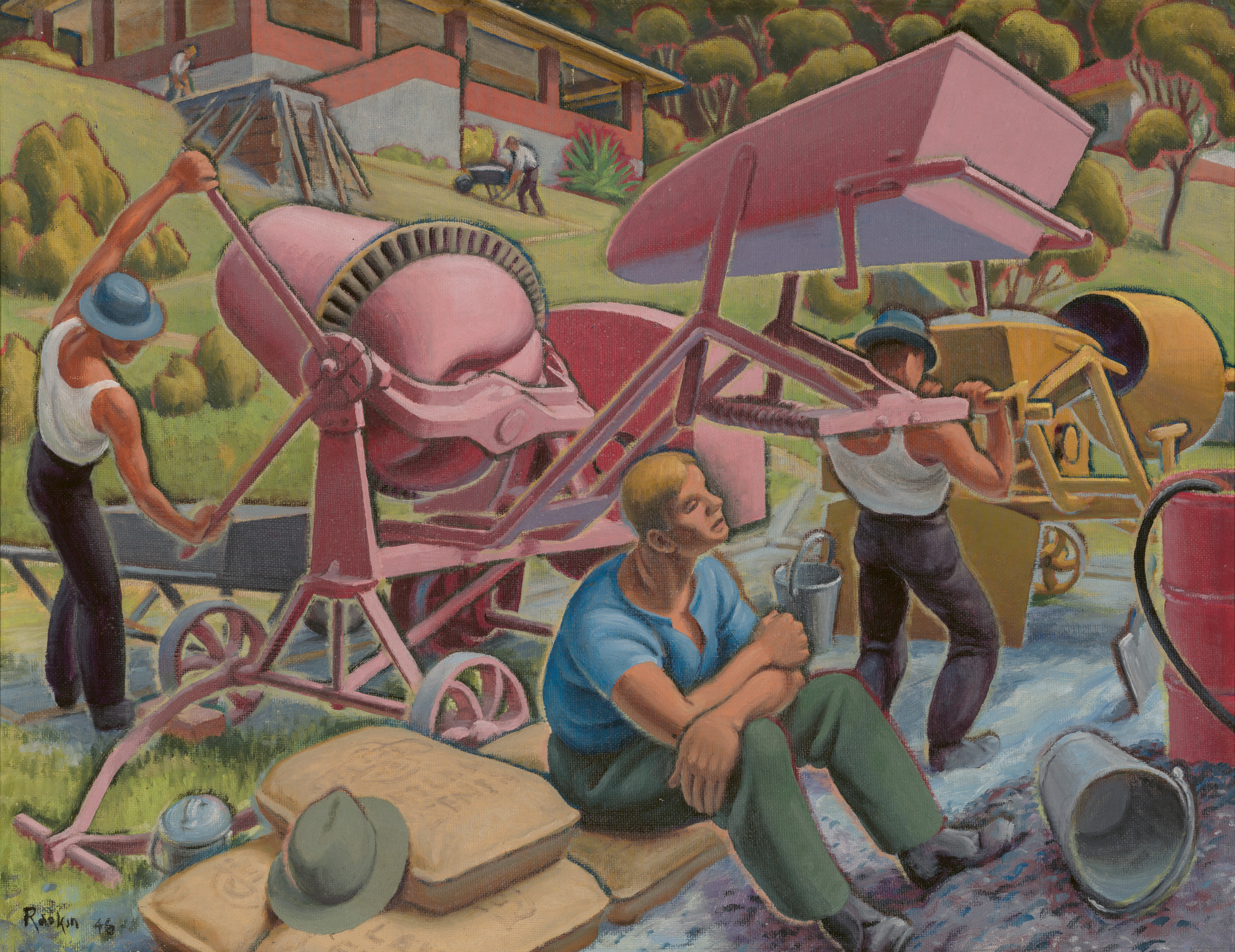 Hawkins first studied and exhibited in the years leading up to World War One and was greatly inspired by the Vorticist movement’s use of angularity and compositional dynamics. During the war, however, Hawkins was horribly wounded leaving him with two withered arms; only the left hand was (just) capable of holding a brush. Nonetheless, he doggedly retrained to be able to sketch and paint again, an almost miraculous feat achieved over an eighteen-month period. He returned to exhibiting but, annoyed at the attraction his art now gained due to his injuries, he began signing his name ‘Raokin’, a play on an Italian mispronunciation of his name. Apart from Vorticism, he was also fascinated by alternate theories including dynamic symmetry, Platonic solids, and magic squares.2 The first works to successfully align these influences date from the mid-1920s when he was exhibiting in British groups shows which included Vorticism’s founder Wyndham Lewis. Hawkins’ paintings include a number of intimate studies of his domestic life as well as charged, sinuous landscapes, but he was also attracted to ‘subjects of strenuous work and play. [I]t was his tough mind which chiefly created order out of chaos in works which he hoped might help to make the world a better place.’3 In Concrete mixers, the physicality of the scene would have included noise, oaths, sweat and fumes; yet Hawkins’ skill at design – his ordering of the ‘chaos’ – results in an image that elegantly charts the progress of the workers, from first pour of the concrete, though to toiling up the hill with a wheelbarrow, and finally, the return for a well-earned breather. His colours, dominated by a radiant pink, enliven the experience.