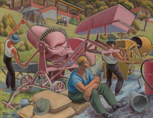 Hawkins exhibited Concrete mixers at the Contemporary Arts Society (CAS) in Sydney shortly after its completion. Titled Eighth Annual Interstate Exhibition, this was one of the first post-war gatherings of CAS artists from across the country, an extraordinary collective statement which included Arthur Boyd, Sidney Nolan, Jean Bellette, Margaret Olley, and many others.