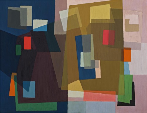 While some of Balson’s constructive paintings follow the right-angled geometry of Mondrian, who he once described as his ‘greatest single influence’, this work from 1953 breaks away from the order of verticals and horizontals, juxtaposing a series of less regular shapes that playfully jostle for prominence. There is an energetic movement across the painting’s surface in the complex layering of forms and the push-pull between positive and negative space. Striking colour relationships play a key role too, as oranges and vivid watermelon pink sit atop rich blues and purples, olive green and to the right, paler shades of mauve and grey. While at first glance, some colours appear to have been painted over others to create a darker tone, each colour has been applied individually, independent of those immediately adjacent, emphasising Balson’s understanding of colour and virtuoso skill with the chromatic possibilities of his medium. One of the larger scale works painted towards the end of his constructive series, this painting reflects Balson’s confidence and mastery of abstract form and colour.