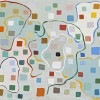 The surface of Constructive Painting features a series of simple squares of almost uniform shape and size, existing independently of each other, not overlapping, but suspended in space. We also see dissolving boundaries of form and fields of colour. Both of these elements featured very rarely in Balson’s constructive paintings, and were key stylistic developments leading towards his tachiste non-objective works.4 Surprisingly, what links these imprecise squares scattered across the picture plane is a meandering series of brightly coloured lines woven into the composition, breaking the otherwise grid-like composition. The brushstrokes of these lines and of the painterly tonal background contain the trace of the artist’s hand, marking a gestural break in his philosophy of mathematical self-effacement. Balson was now released from the impersonal and serene rigour of his former geometry, and henceforth allowed himself to embrace the ever-changing fluidity of the universe.