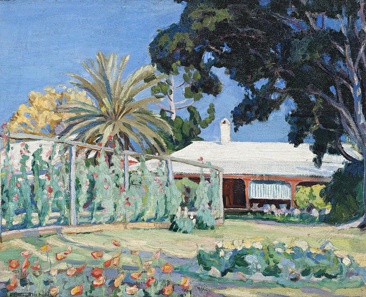 The large Bell family became patrons of their community and were popular, fashionable figures who entertained royalty, film stars, authors and artists. Edward, Prince of Wales visited the property in August 1920. At the end of 1926, Rix Nicholas purchased a car, filled its rear compartment with painting equipment and, together with Dorothy Richmond, set out to paint the landscape, ranging from Canberra and the Monaro plains to the south, up into central Queensland. The artist’s intimate glimpse of the homestead and garden was most likely painted on this trip.