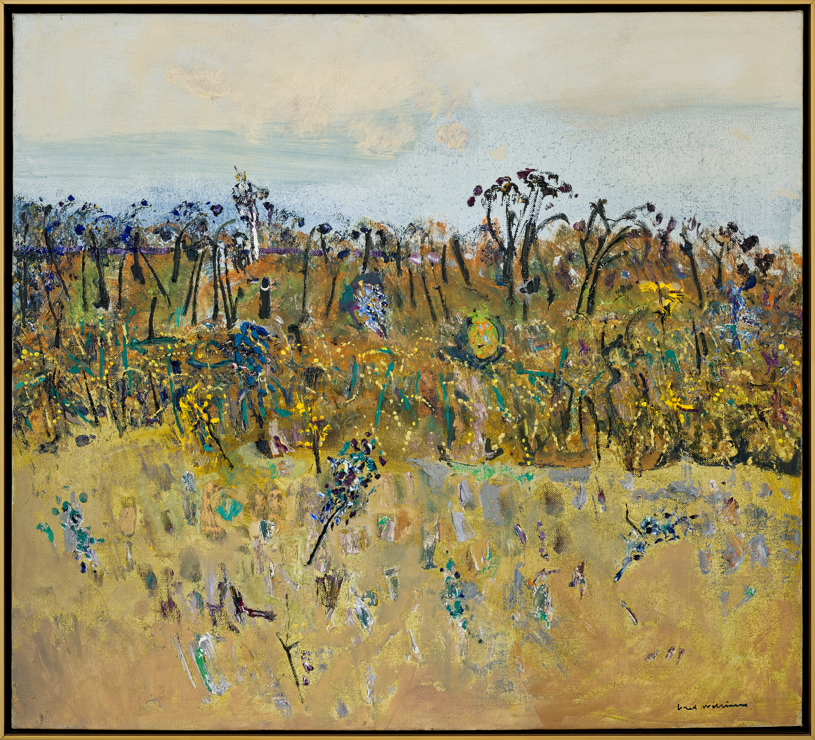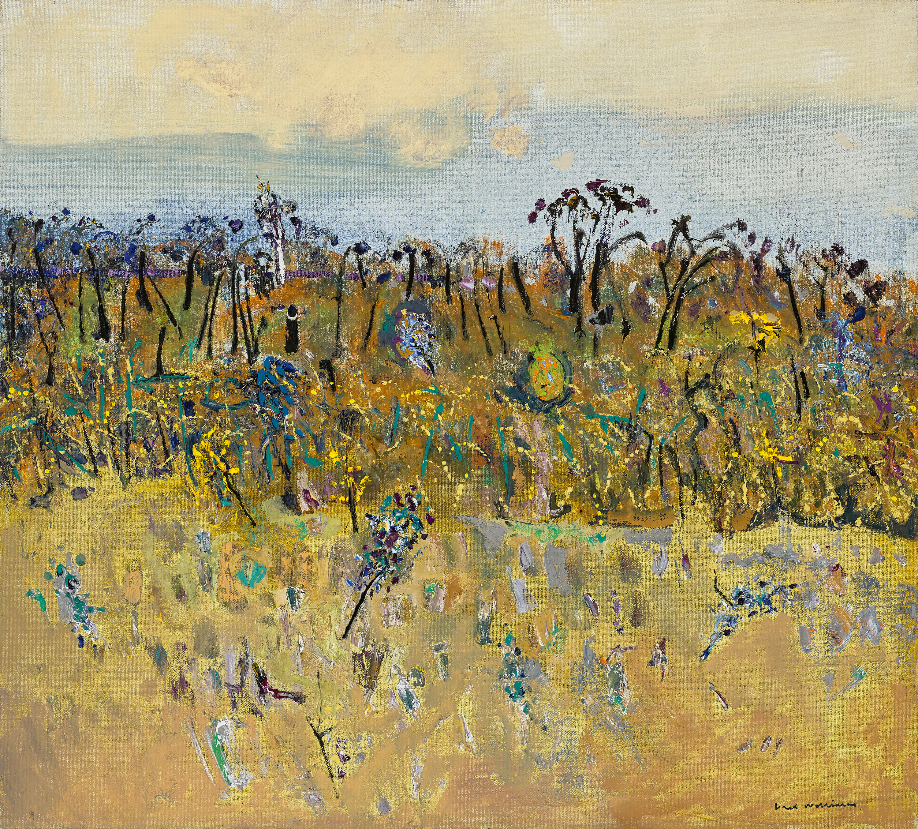 Errant in the area of Cottles Bridge, Fair and Williams stumbled upon an overgrown botanist’s garden in St Andrews, almost a century old, with a ‘remarkable coll[ection] of wattles and shrubs’. Its impending demolition prompted the artist to wonder, aghast, ‘it will only take an hr for a bull-dozer to get rid of it?’5. Stimulated to commemorate in paint this dense native garden, dominated by Cootamundra wattles (acacia baileyana), Williams recorded this landscape with a small suite of paintings. This series included Botanist’s Garden, 1975 and St Andrews (The Botanist’s Garden), 1975, two close and densely tangled views of expressive gesture. In contrast, Cootamundra Wattles bears Williams’ semi-abstract compositional structure of three horizontal bands, whose contrasting colours creating an airy and dry vista with the illusion of spatial depth. Derived from, or at least influenced by, the artist’s strip gouaches of the early 70s, this tripartite composition narrows the focal point into a central band of painterly texture - here a dense and gestural wall of vegetation, crowned by a row of black-trunked wattles and a single white-trunked gum, jutting beyond the thick violet horizon line. A sparse and scrubby expanse of bush in the foreground is created by leaving visible both the ochre yellow ground and coarse weave of the canvas. The uppermost section of Cootamundra Wattles features an animated blue sky, complete with puffy white clouds and diagonal sweeping brush strokes signalling an impending storm.