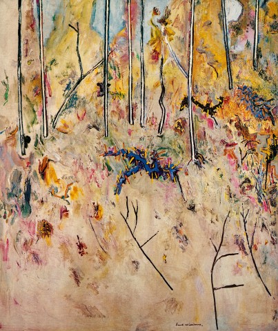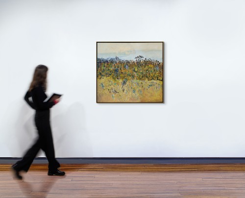 In mid-1975, Fred Williams held two major solo exhibitions, his first in both Sydney and Melbourne since the late 1960s, displaying his full painterly might in a vast array of turbulent new paintings, and conveying old and new motifs in a vibrant unmixed chromatic palette hitherto unseen in his work. Reflecting on the impact of these rich and varied exhibitions, Margaret Plant wrote ‘Williams has, I believe, made a conscious effort to expand his own sense of his work: to stop the edges going soft. I see this rebellion as a rare and important example of an Australian artist, able to undo the safety net of his art: to paint dangerously’.1 Although absent from these exhibitions, having remained in the artist’s own collection and purchased directly from the artist’s widow in 1989, Cootamundra Wattles – Botanist’s Garden belongs to this radical and riotous group of works in which Williams allowed himself to express his delight in the landscape.