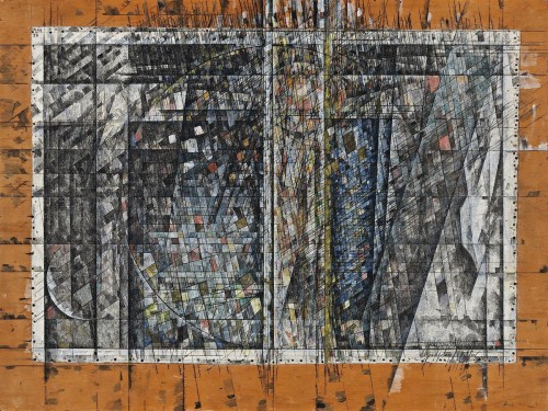 Godfrey Miller was by all accounts an eccentric man, but also a distinguished and fastidious artist. With what Paul Haefliger, the Sydney Morning Herald art critic, once called a ‘tortuous technique’,1 Miller created complex and deeply cerebral artworks that vibrate with musicality and the intensity of the artist’s personal communion with each of them. His artistic execution, though laborious, was crystallised and refined over many years – each painting going through a gradual process of accretion and removal of lines and colours. They passed through years of successive stages: from monochrome lattices, to the addition of colour and finally the modelling, or what Miller would call the ‘science of drawing’.2 This process endowed his artworks, drawings and paintings alike, with what became his trademark web of intricate cross-hatching, running throughout the composition, and inscribing his compositions in three dimensions. For these reasons, many of Miller’s works are dated with wide tranches, and the artist was said to have considered about 40 of his paintings ‘completed’.3 Crucifixion, c.1962, although not the only painting bearing this title, is the only one that was signed, attesting to the fact that Miller considered this example complete and resolved.