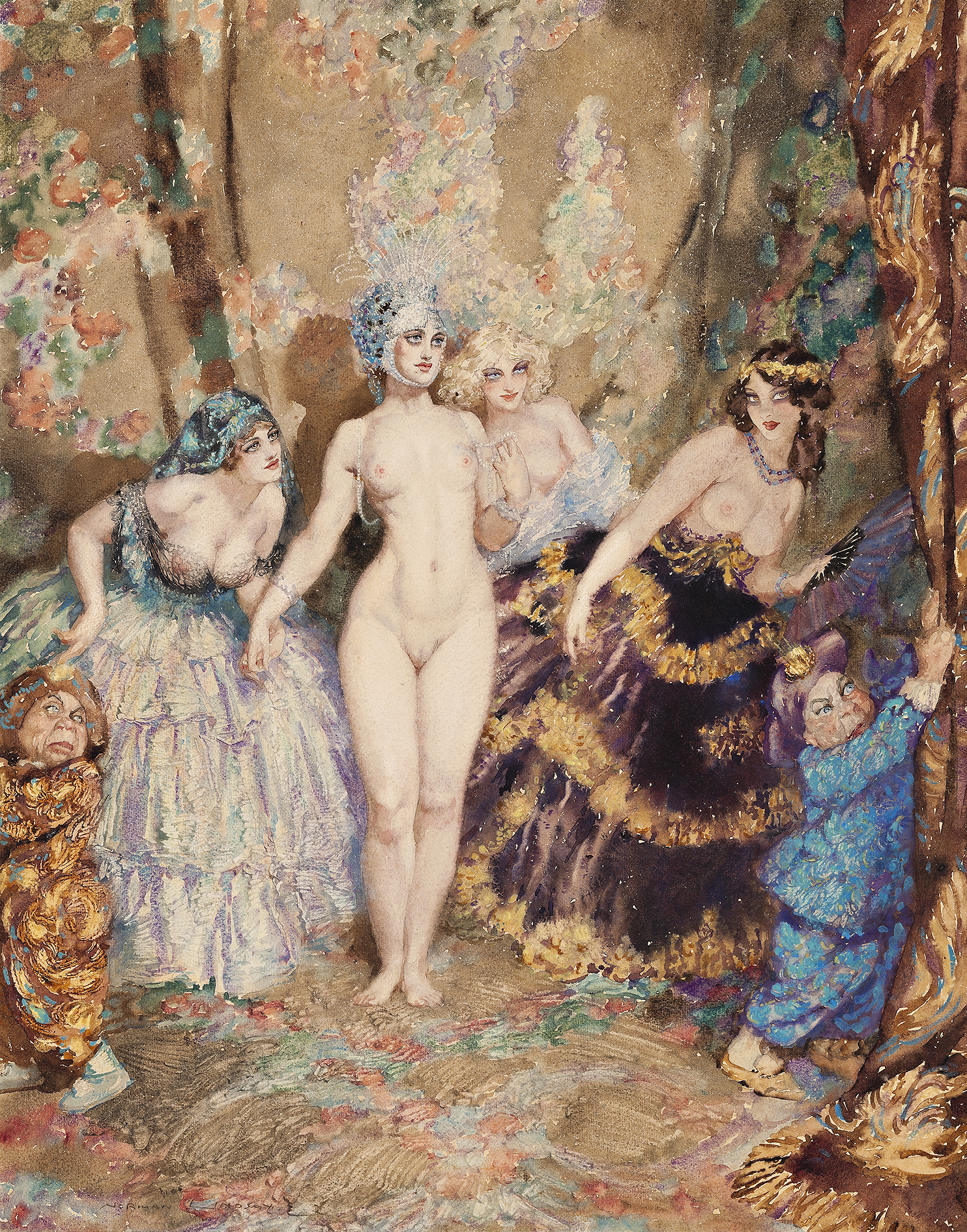Norman’s Lindsay’s explorations of the femme fatale, the lyrical and the demonical which no mere male can resist, enjoyed numerous manifestations in a varying mix of enticement and the slightly confrontational. The naked centerpiece might be the beautiful Venus, goddess of love, or if of Junoesque proportion, Juno herself, mighty queen and well suited to the all-powerful Zeus. Throughout Lindsay’s oils and watercolours, leering buccaneers and bacchanals abound, peopled with buxom beauties and naked ladies plumed with fantastic headdresses. Spring’s Innocence, 1937, in the collection of the National Gallery of Victoria, Melbourne, is heavy with erotic fruitfulness. Another major oil, Incantation, 1940, (Deutscher and Hackett, Sydney, 1 September 2010, lot 32) seems to have had its genesis in The Curtain. As in the watercolour La Premiere Danseuse, 1930 (private collection, New South Wales), many of Lindsay’s finest early watercolours were inspired by the theatre, especially the ballet and its language of captivating movement. Among these, The Curtain, with its nubile ladies, is one of the best.