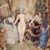 Curtains are suggestive. They hide what is behind them. When drawn, curiosity and expectation are replaced by the excitement of the presentation. In this sparkling watercolour The Curtain, 1921, by Norman Lindsay, a feast of visual beauty is revealed as dwarfs pull aside the heavy drapes. The sense of theatre is palpable as the ladies present themselves on their very private stage. With the performance about to begin, the audience, alias the viewer is invited to join in. Narrative in Lindsay’s art unfolds through the eyes and gestures of his players, highlighted by theatrical effects and presentations. Fascinating of eyes, these ladies look outside the picture to fix on members of the audience. Only the dark lady of the far right engages the viewer directly with coquettish look and invitation. This she confirms by her fan and its own flirtatious language. The fan held open in the left hand was an invitation to engagement.