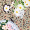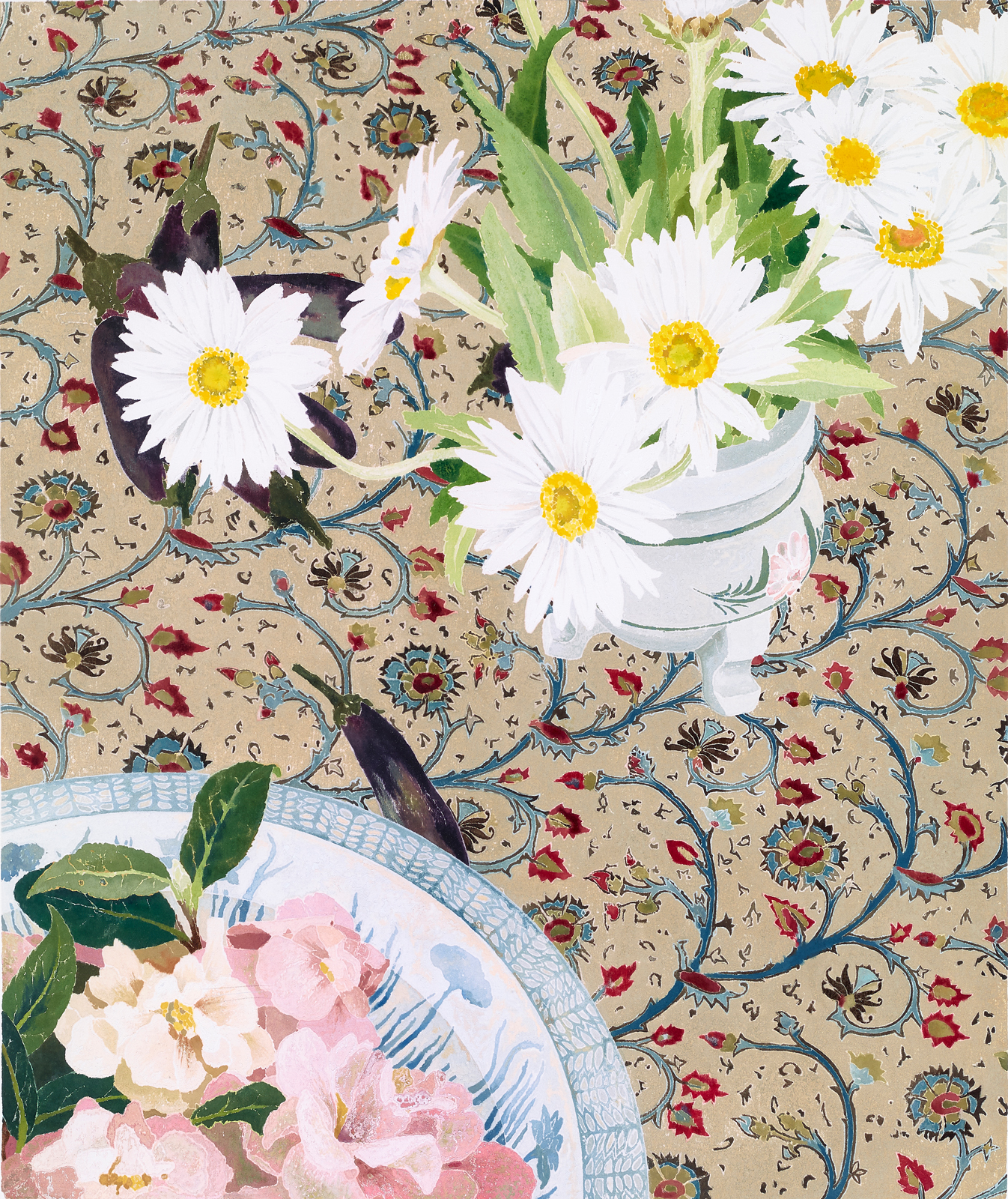 The decorative combination of flower arrangements and patterned fabrics collected during the artist’s travels has appeared in many of Campbell’s most successful works, including Nasturtiums, 2002, Bougainvillea, 2003 and Ranunculus with Painted Cloth, 2010. Daisies and Camellias on Indian Cloth, created in 1996, is amongst these, also revealing the artist’s signature precision and prettiness. Closely cropped, this domestic still life depicts pink camellia blossoms placed in a bowl and fresh daisies stretching joyfully across a tablecloth, its dense paisley pattern concealing finger eggplants casually strewn across the table in preparation for a meal. Almost all of Campbell’s still lives are semi-autobiographical, displaying in their subject matter and aesthetic structure cultural crossovers indicative of the artist’s own eclectic and multicultural interests. In this composition, a Malaysian Nonyaware porcelain bowl is filled with blossoms, placed on a Mughal paisley block-printed cloth, together arranged in a scene designed following Japanese principles of woodblock printing.