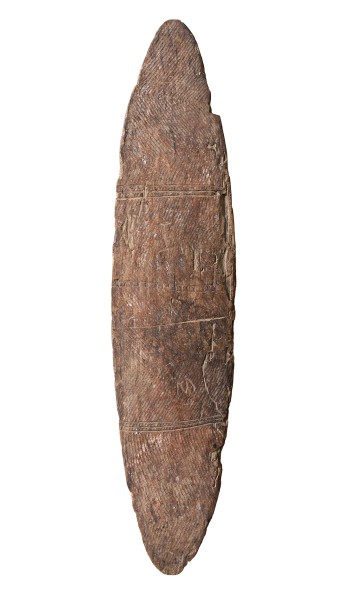 bears old collection label attached by string that bears inscription: ‘1916 From V. Paton, Port Leo IV Presbyterian Mission’ and verso: ‘Shield for hunting boomerang, Bardi tribe Sunday Island’