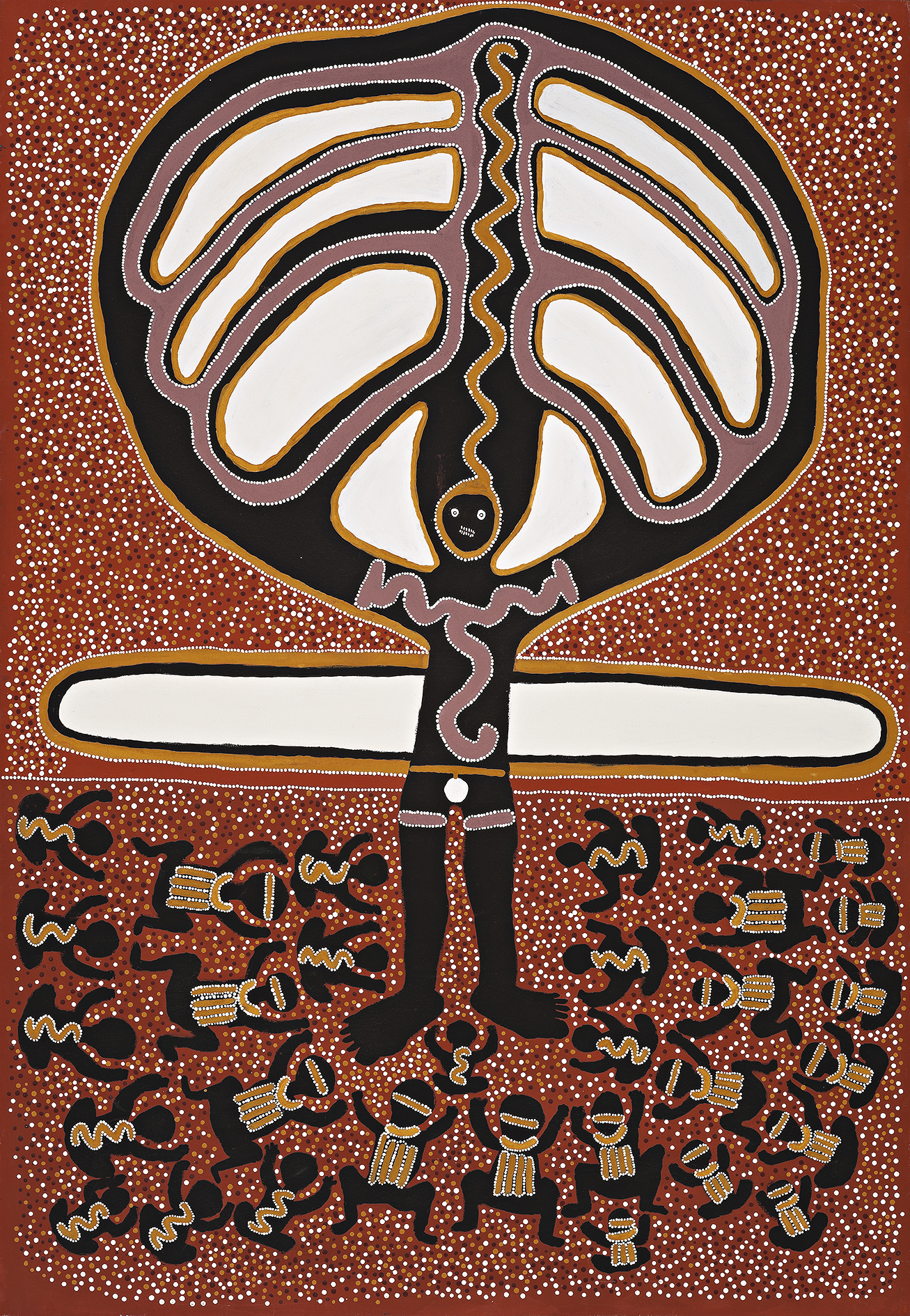 The original accompanying certificate of authenticity stated in part: 'Kurtal is a Storm Being from the Ngarangarni – the Walmajarri word for the Dreaming. [...] When Kurtal entered Jarinyanu's country he was nearing the end of his journey. [...] Before a gathering of people from this area, Kurtal danced his final dance, metamorphosed into a snake, and sank into the earth where he remains today in a permanent rockhole spring. This spring supplied a reliable supply of water in all seasons, but in addition the old man would perform rituals at this site during the hot weather season to make Kurtal bring rain. [...] He is held to be responsible for and present within those particularly dramatic storms that usher in the break of the rainy season. [...][Dance of Kurtal, 1988] reveals Kurtal generating storms, with his arms and head enveloped in a cloud streaked with lightning and dust. A vertical snake motif suggests Kurtal's face is simultaneously the head of a snake, prefiguring his approaching metamorphosis. A band of cloud at his waist divides earth from sky. The lower section shows a grouping of women, girls and young boys. The women wear a vertical-striped body paint while the boys are painted with a snake motif.'