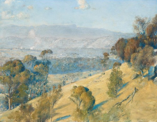 As the golden summers of Australian Impressionism gave way to bronzed autumns, Tom Roberts and Arthur Streeton moved their focus from Heidelberg to the Dandenong Ranges, outside Melbourne. After diversions abroad, the neighbouring hills and valleys became their ‘Australia Felix’. Streeton acquired land at Olinda in 1921, then lived there. From years in England, Roberts returned to Australia in 1923, he and his wife Lillie settling at Kallista. They named their place ‘Talisman’ after their son Caleb’s house in Essex. Here Roberts painted a number of lyrical landscapes, among the finest being The South Wind, 1924, in the collection of the National Gallery of Australia, Canberra and Sherbrooke Forest, 1924, in Sydney’s Art Gallery of New South Wales. Compositional accents are strong, the tall, slender gums, verticals of The South Wind, reaching a crescendo in Sherbrooke Forest, offset by the flow of hill lines in one, rising curves in the other. Continuing in the lyrically atmospheric Dandenong Landscape, 1923, Roberts painted the moment with the afternoon sun at his back, shadows beginning to lengthen. Luminous, elevated through the grandeur of the panorama, stillness and balance disrupted only by the strong diagonal, corrected in the accent of gums, they are touched with gold as they stand sentinel over beauty. When Roberts exhibited a number of recent works at The Fine Art Society’s Gallery in September 1924, their ‘poetry’ won the applause of the reviewer for The Age, ‘peace and plenty’ for The Argus.1 For Sydney and his 1926 exhibition, it was his ‘sense of atmosphere’ that attracted attention.2