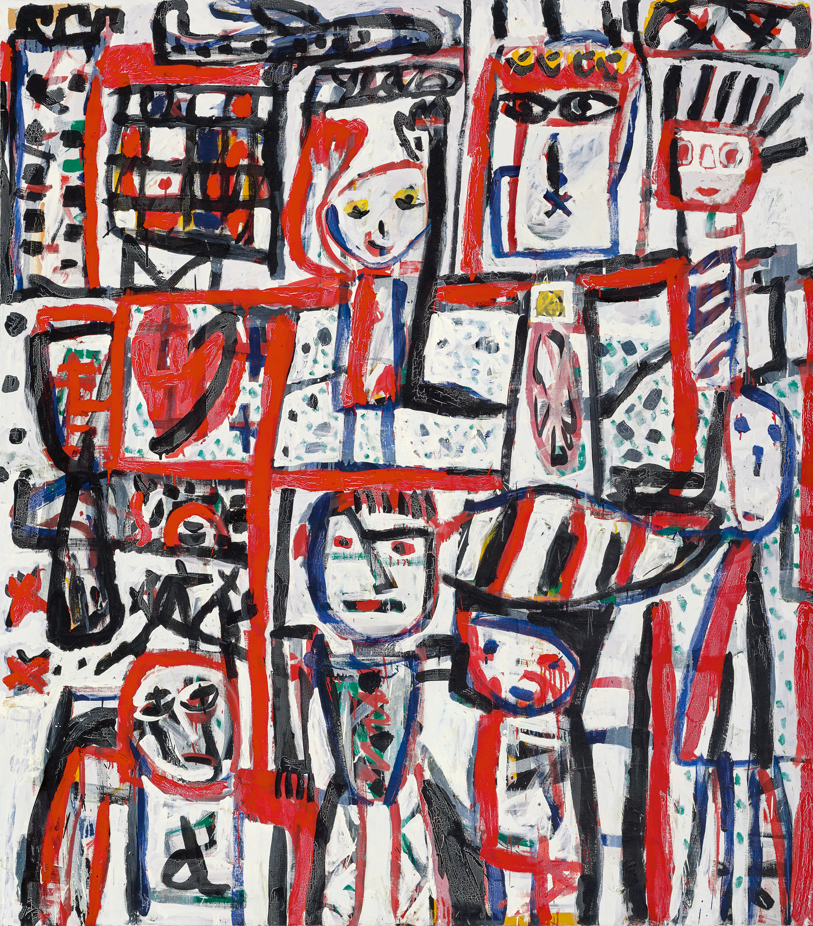 Largely self-taught, Larwill had a sporadic art education, studying briefly at Prahran College of Advanced Education in 1975, followed by a stint at Preston Institute of Technology in 1980. Heavily influenced by both the work and spirit of Australia’s Angry Penguins, and by international artists such Paul Klee, Picasso, the CoBrA group and Jean Dubuffet and his interest in ‘art brut’, Larwill’s own work was unplanned, spontaneous and emotive. Through a process of trial and error and a willingness to experiment, Larwill quickly arrived at the kind of ‘signature style’ that we witness in Departure I, 1985 with its characteristic childlike figures, all-over patterning, bold palette and thick, assured brushstrokes. Yet despite the intuitive nature of Larwill’s approach, the densely packed forms of Departure I also highlight the way in which he continued to work an image – applying multiple layers of paint and adding and subtracting motifs2 – until he was satisfied with it. As he had said: ‘I start by just drawing figures and lines on the canvas. Then I keep flipping the canvas round until I see something to build on, or what seems to be coming out.’3 ‘You’ve just got to put your heart in it and be honest.’4