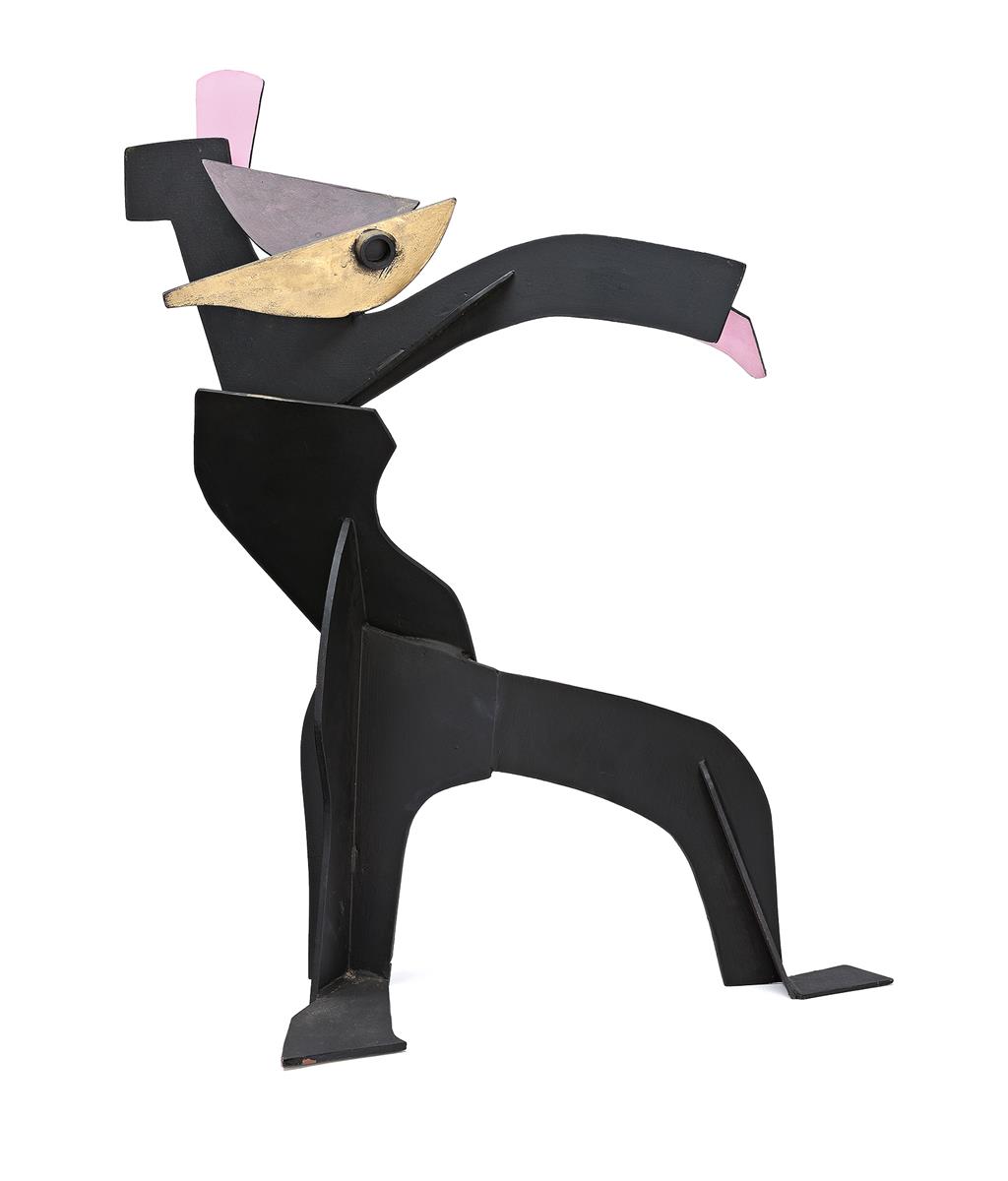 Teetering precariously with joyful and flamboyant expression, Inge King’s second maquette of Dervish is imbued with a sense of movement that contradicts the solidity of its assemblage. Although directly descended from her geometric totemic sculptures, King’s dancing silhouettes were the most figurative artworks of her later career. They retained the planar quality of her abstract works, becoming three-dimensional collages of sheet metal. Inspired by Henri Matisse’s iconic decoupages,1 Dervish and its accompanying dancers interact with the space around them – the intersecting planes of their construction playing with depth and shadow, extending their outermost limits beyond the physical boundaries that confine them. The surprising addition of small elements of colour assisted the creation of ‘not only significance and shape, but also extremity, distance, and advancing and receding planes’.2
