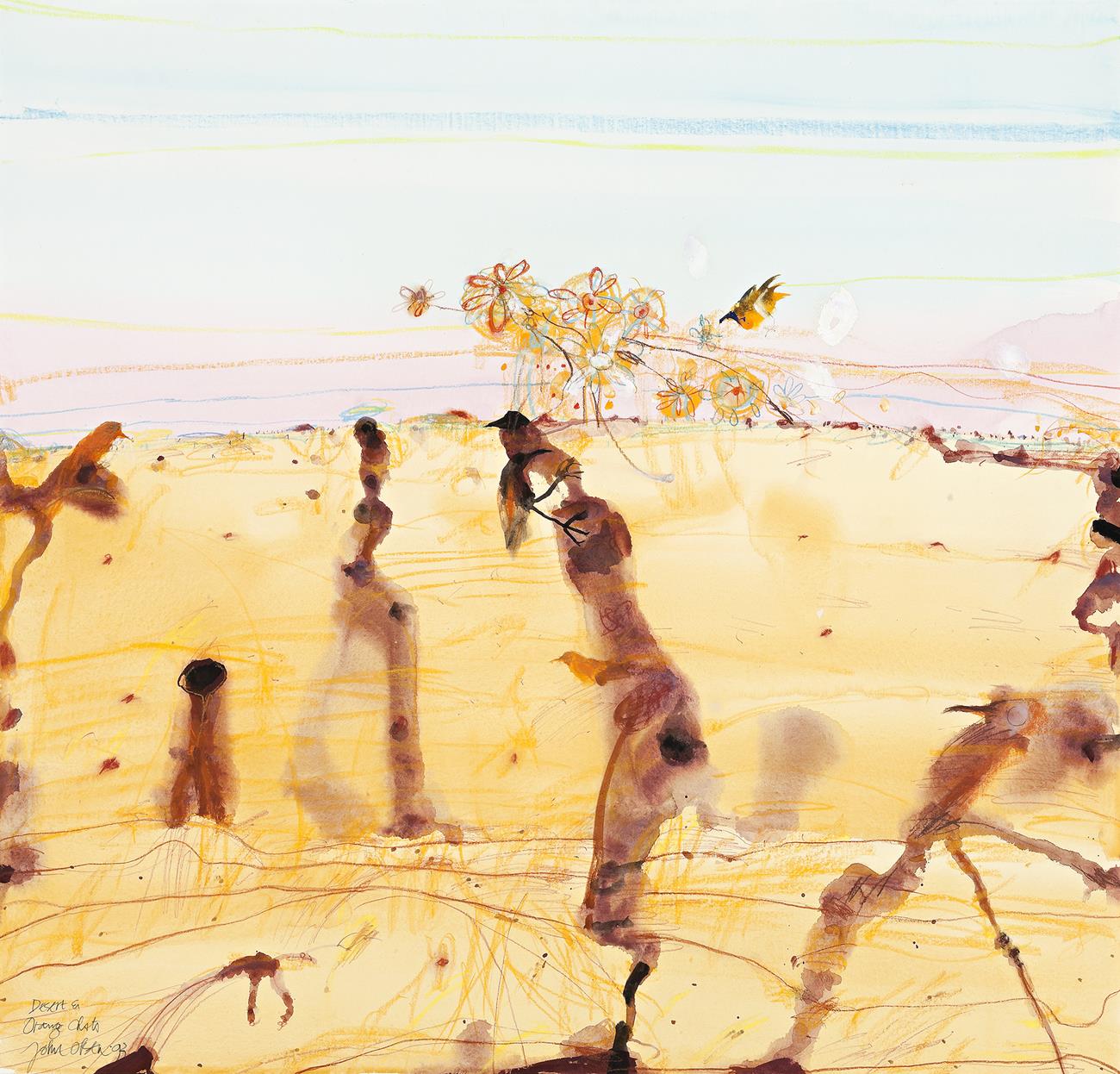 signed, dated and inscribed with title lower left: Desert & / Orange Chats / John Olsen 93