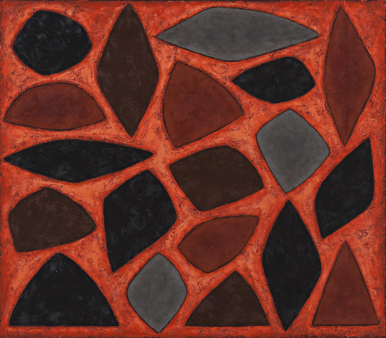 Painted with a varied surface texture and tonal intensity, Desert Country, 1990 has a clear organic quality. Having now reached the peak of his success, Coburn was now to producing works with immense fluidity and creative freedom. As noted by Lou Klepac, Coburn during this period ‘had now reached a stage in his development as a painter where all influences and experiences merged, enabling him to establish a new and more private rapport with his paintings. He had mastered the complexities of the creative process and was no longer dependent on the demands of a particular style’.2 The rock shapes that adorn Desert Country, 1990, painted in dusky greys and earth reds, form a composition which is designed, yet seems graceful and effortless. Radiating passion and energy, Coburn’s symbols speaking eloquently of the land, much like the indigenous artists he had admired throughout his career.