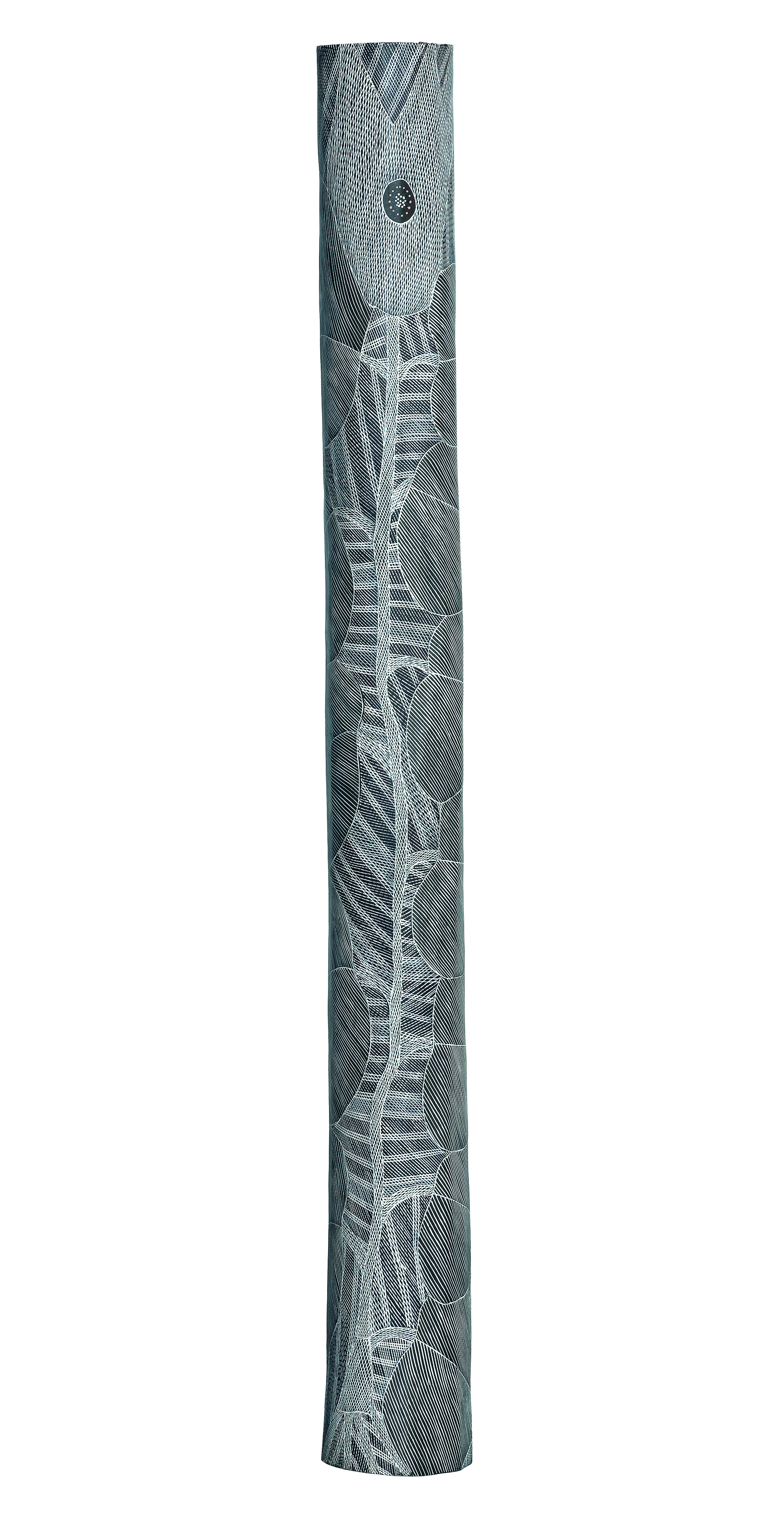 This work is accompanied by a certificate from Buku-Larrngay Mulka Arts which states: ‘This work represents Garrimala, a billabong near the artist’s residence, the Dhalwanu clan homeland at Gängan. It is a sacred site for the artists’ mother’s Gälpu clan. But this imagery really refers to perhaps the oldest continuous human religious iconographical practice – the story of the Rainbow Serpent in West Arnhem rock shelters. Wititj is the all-powerful Rainbow Serpent (olive python) that travelled through Gälpu clan lands and on further, during the days of early times called Wanarr. Djaykun the Javanese file snake is a companion and possible alternate incarnation of Wititj, living in amongst the Dhatam, or waterlilies, causing ripples and rainbows (djari) on the surface of the water (one reference in the cross hatch).’