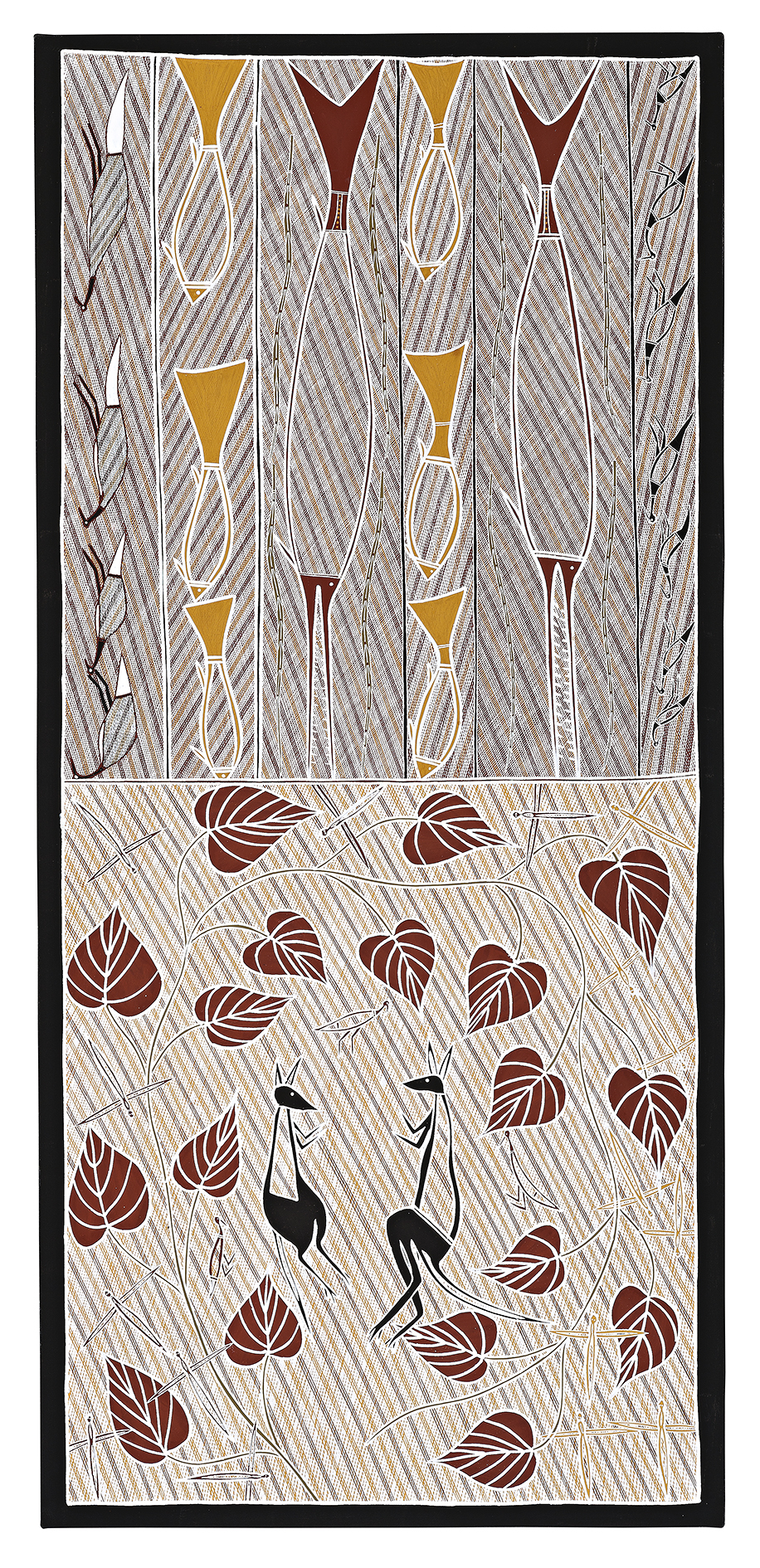 This work is accompanied by a certificate from Bula’bula Arts which states: ‘All Aboriginal people originate from a spiritual source, fixed in a particular place in their land or the sea. These ‘Spiritual Reservoirs’ are often in the form of special waterholes made by Wangarr (Creative Beings), long ago close to the beginning of time. These creator beings moved across the country side, shaping the land and implanting in each tract of country, the spiritual life force for the people who were to own it. These Creative Spirits took many forms. When they gave the land to each group they also gave songs, dances, ceremony, the associated laws and language.’