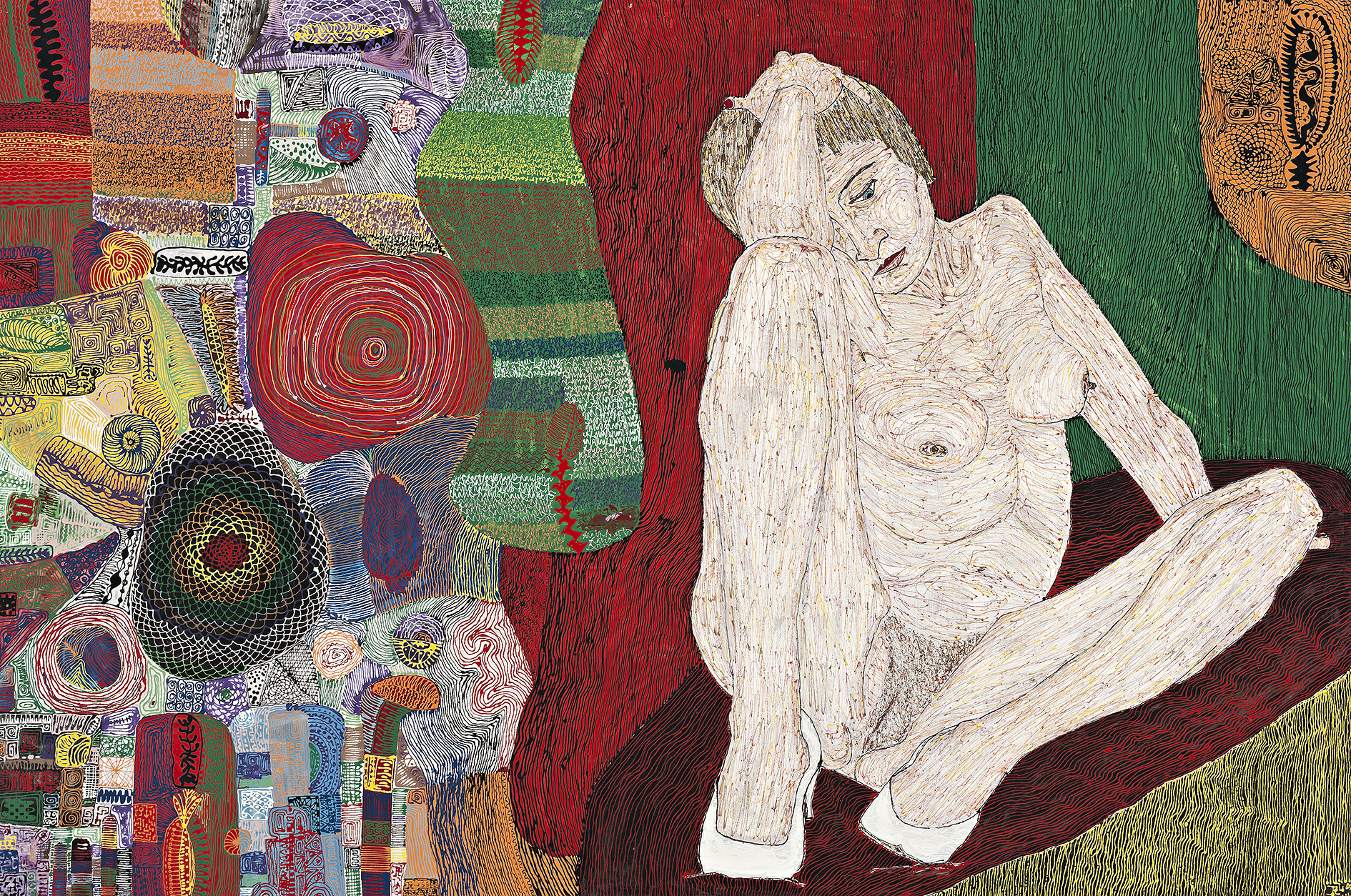 The decorative, richly patterned background of Dithyrambic Painting is balanced equally with the figurative aspects of the painting, emphasising the artist’s propensity to stray from the techniques commonly taught in traditional art education. ‘After all, if Picasso (old enough to be my grandfather then) could paint both abstract and figurative why should not I? He empowered me – he was saying “please yourself sunshine”’.2