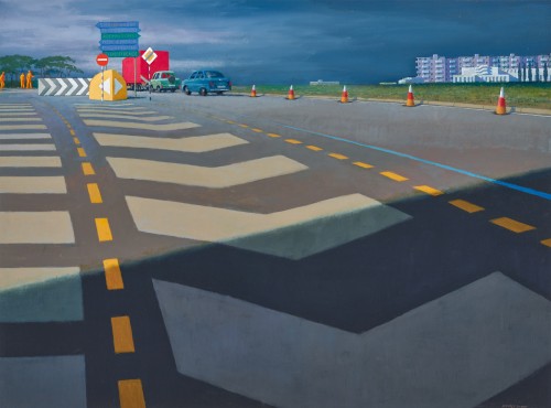 In his best mature paintings Jeffrey Smart always played visual games, confident his viewers would delight in hunting for sequences in geometry, proportion and colour. Diversion for Siena is rich in this characteristic visual wit. Colours of vehicles alternate; so do the shapes of two traffic signs (circle, diamond); then there are five coloured traffic cones rhyme with the orange boiler suits the other side of the work; while contrasted patterns of road markings (directional arrows, dashes, straight lines) are used to excess. Of course, the dominant curve of the roadway, indeed, all the principal lines in the painting’s design, lead the eye to three large shapes in bright colours set in the upper left: a yellow junction divider, a blue road sign with green bands, and a red freight container. Ever playing his witty games, Smart even has the white arrows on a temporary barrier point out those main shapes.