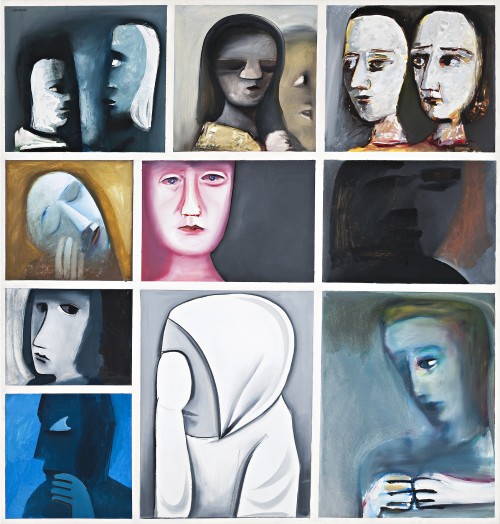 Divided Painting, created shortly after Blackman’s celebrated Suites I – VI held in the collections of the state galleries of New South Wales, Queensland and Western Australia, captures the same exploration of sequence, the considered grouping of images in a multi-facetted ensemble, using the connections between each frame to create groups of collective expression and clear vectors through which to read the painted surface. Divided Painting shows a detailed investigation into portraiture, featuring Blackman’s recurrent shadows, silhouettes and faces drawn with an almost naïve simplicity and formal economy of detail. Grouped together, they provide a kaleidoscopic view of individual moments of solitude, grief and confusion – while these figures are physically and formally united in a single work, they remain trapped within their respective frames.