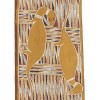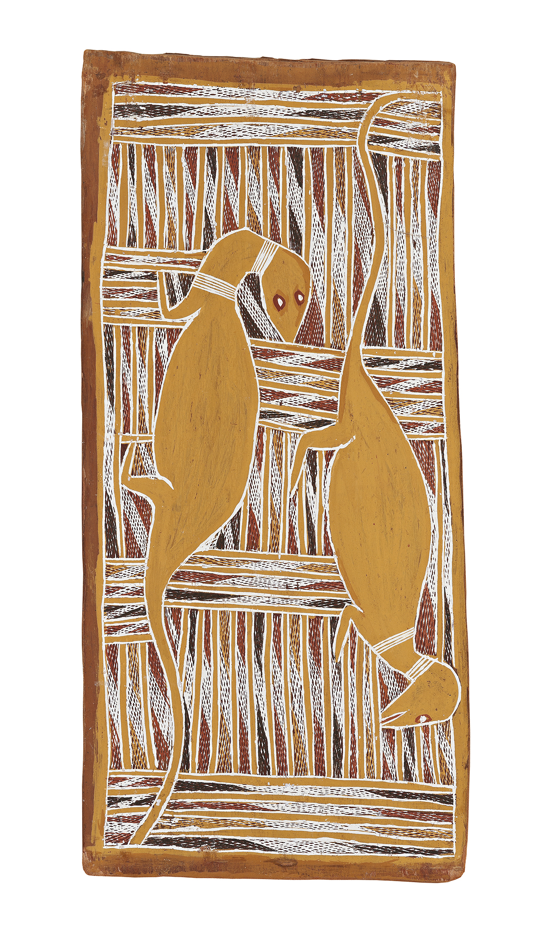 The bark painting is of two sacred goannas known as Djanda and are part of the Djan’kawu creation story. The Djan’kawu were the creators. They created waterholes, flora and fauna, and the people of the Dhuwa Moiety