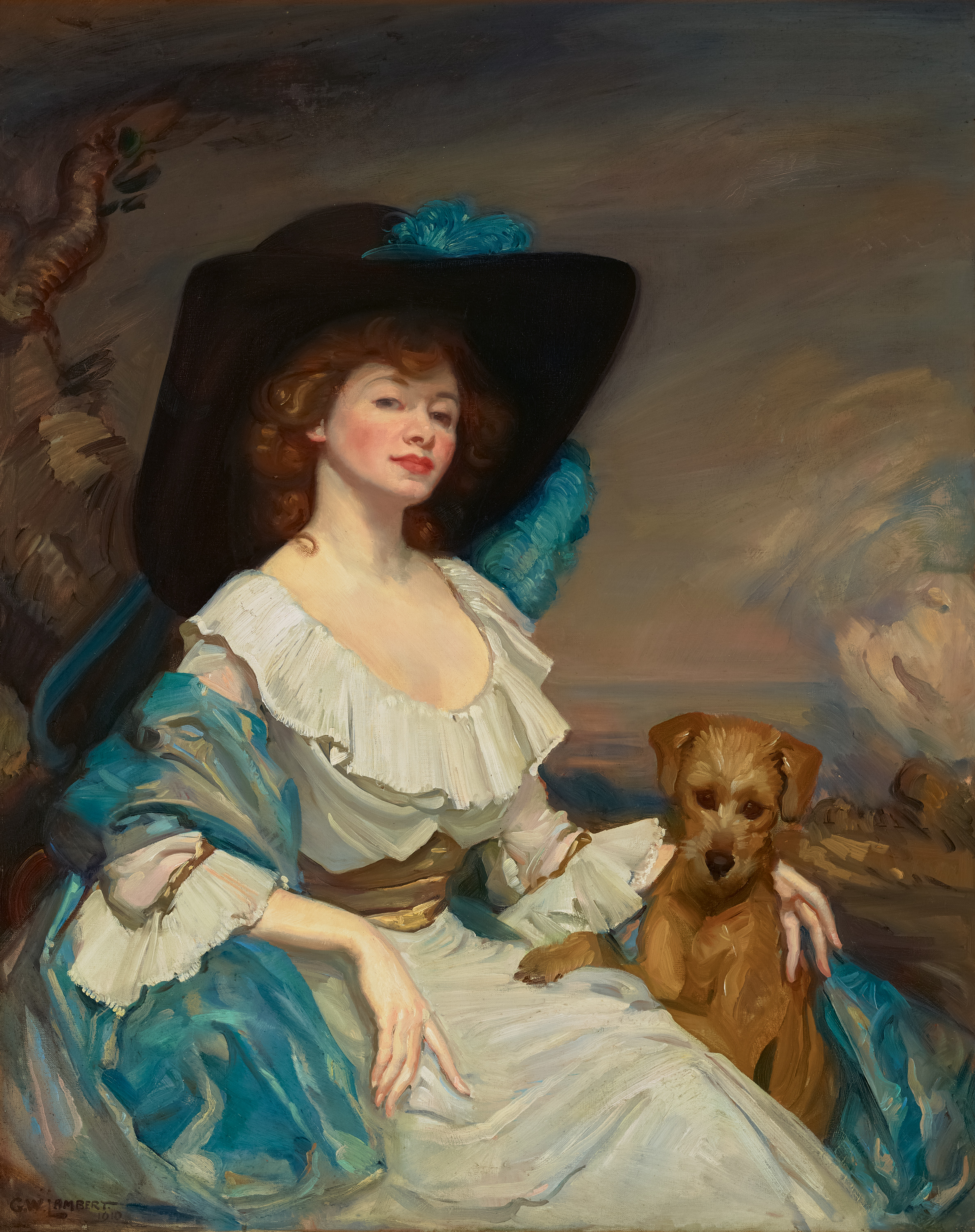 In this quintessential age of feminism, Lambert endowed these belle époque pictorial moments with poise, elegance and eye-catching gestures. For Mrs Dutton the look is direct; for Doña Sol it is haughty. The latter has sensuality in abundance, heightened by bravura. Detachment and a sense of the unobtainable adds a new edge. Andrew Motion, writing on Lambert’s portrait, Miss Thea Proctor, 1903 (Art Gallery of New South Wales, Sydney), observed that: ‘Its potency depends greatly on its restraint’, adding, the handling of the paint ‘is intensely sensuous’,2 a characteristic shared with Doña Sol and others. Naked flesh, liberally revealed, and underlying eroticism are celebrated in elongated neck and arms. Doña Sol is identified by Anne Gray as ‘An exhibition piece, not a commissioned portrait’3 – the dog giving a clue to the otherwise enigmatic nature of the painting.