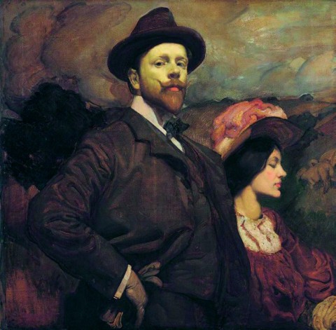 In London’s Edwardian age, sophisticated beauties of fashionable inclination happily indulged themselves in hats of outrageous size. Society portrait painters responded with alacrity; two exceptional three-quarter length works of this time by George Washington Lambert were Mrs Henry Dutton of South Australia (Guy Morrison Collection, London) and our painting, Doña Sol. Both were painted in 1910. Aristocratic and gracious, Emily Dutton’s low-cut black dress enhanced her beauty. The dress of the more theatrically inclined Doña Sol was likewise low cut, accompanied by blue shawl and blue ostrich feathers peeking cheekily around the edge of a black hat. Lambert silhouetted his ladies beguilingly against romantic landscapes. The ‘trepidation’ of Henry Dutton, Emily’s husband, who commissioned the portrait during a visit to London, was such that he made watchful attendance at the studio sittings.1
