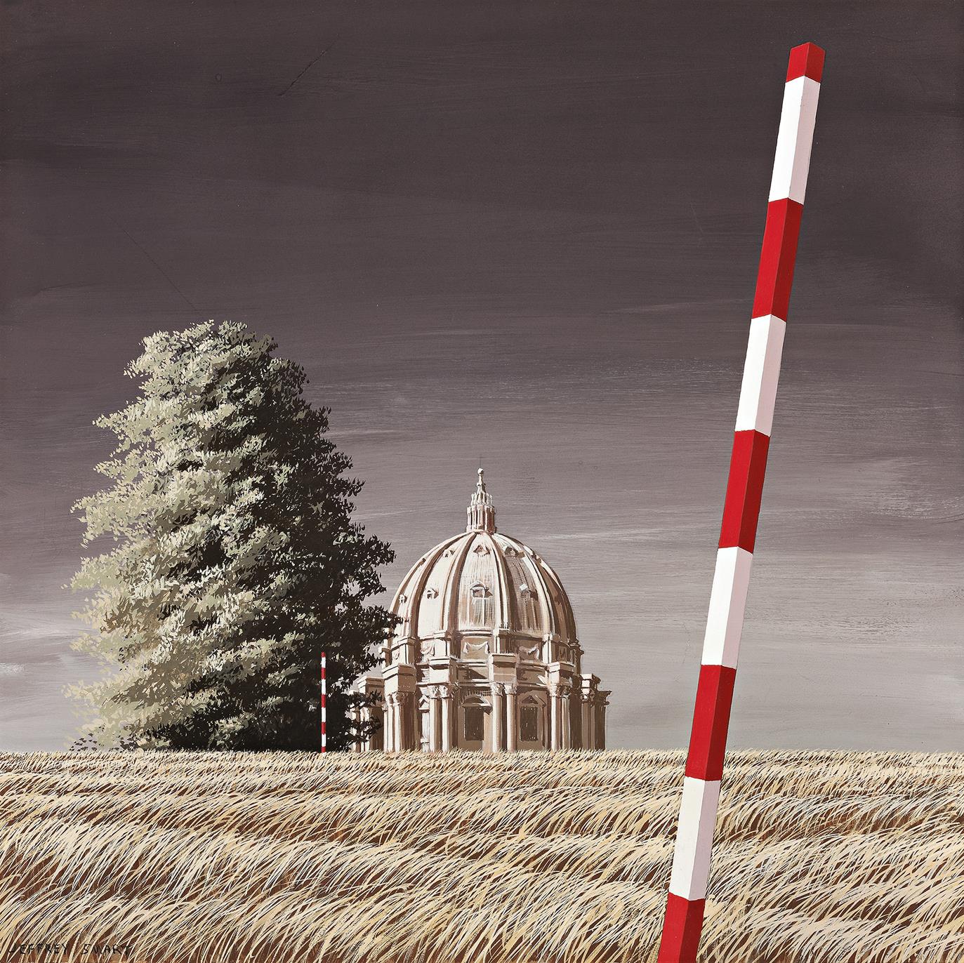 After a burgeoning career in Australia, Smart travelled overseas in the early 1960s and finally settled in a rustic farmhouse in Tuscany in 1971. From this base, he travelled widely, taking notes and photographs of stray industrial oddities and situations. Smart recognised the urban milieu as his true subject, a site of random, slightly surreal couplings that stirred his imagination. A realist by nature (‘I don’t want to be Dufy, I want to be Vermeer’.)2, he would produce many preliminary sketches of his projected paintings, honing the composition until it was truly anchored and harmonious. The Dome, 1977, for example, ‘owes its genesis to Smart coming upon surveyors planning building developments in a field which gave a remarkable vista of (the cupola of) St Peter’s (in the Vatican)’.3 Of the surviving studies, (First Study for) The Dome, 1977 shows only the dome and one surveyor’s pole set against the field of grass, whereas the final image includes two poles and a tree that is thick with foliage. What makes the final image unsettling is that the marked measuring sticks are actually of no use to a viewer when attempting to set a scale of proportion within the painting. ‘Near and far have no significance. … We seek to measure distance, to understand our position, estimate scale, locate objects. Yet we are at a loss in this sea of grass, and without secure foundation for the tree, the dome or the foreground pole which we could reach out and grasp’.4 The art critic John McDonald also noted that the cross on the cupola falls at the exact centre of the composition.5 Such was the precision of Smart’s Renaissance vision.