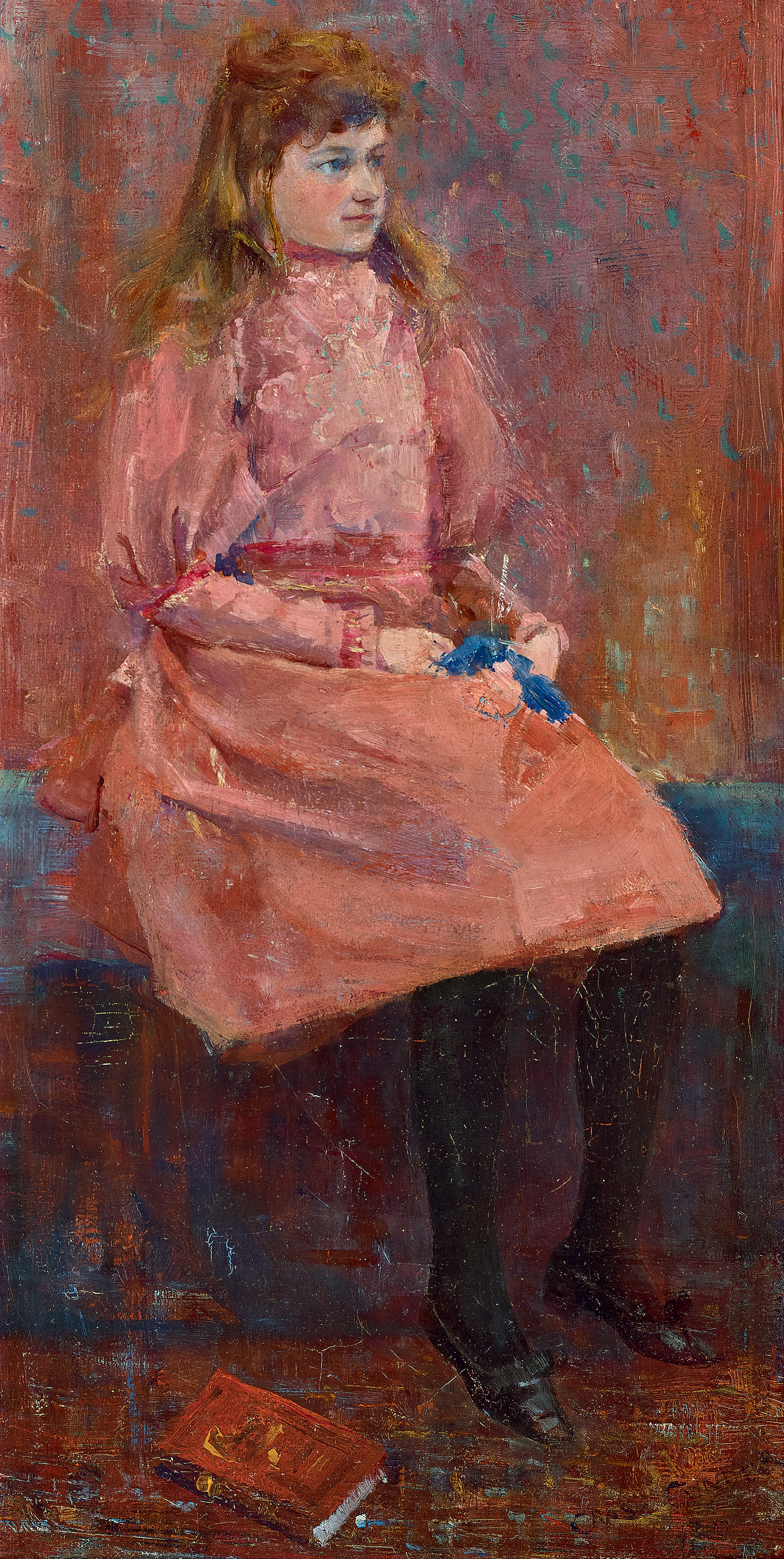 The portrait’s colour continued to receive the critics’ approval later in the month when featured in the Society’s exhibition. The Argus observed ‘Mr. Charles Conder contributes a harmony in red’,2 while Melbourne’s Punch described the work as ‘A charming little study, quite Japanese in its decorative effect of red and blue background. The frame blends with the colour scheme.’3 The influence of Japanese art, especially colour, composition and format, on Conder’s work at this time was pronounced. The narrowness found in some Japanese colour prints, for example, is repeated in the bold vertically of our portrait, seen famously in Conder’s How We Lost Poor Flossie, 1889 (Art Gallery of South Australia) and horizontally in Rickett’s Point, 1890 (National Gallery of Victoria).4