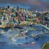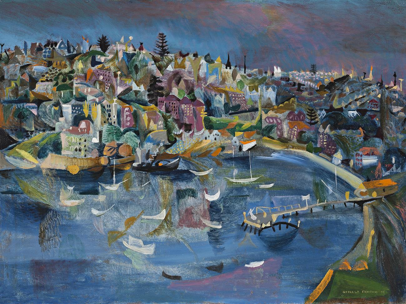 Double Bay is set between the wealthy enclaves of Point Piper and Darling Point and gets its name from the small promontory which bisects it. In the early days of European settlement, the colony’s elite started building mansions there and its continuing reputation as a prosperous suburb began. The enviable harbourside position gave rise to a profusion of pleasure craft traversing its waters and in the 1930s, the foreshore was upgraded to support these activities, including the building of a stone sea wall at the edge of Steyne Park, visible in the lower right of Double Bay. Friend was a former resident in the area having lived in 1946 at ‘Merioola’, an artist’s colony located near the diagonal row of white marks at the top of the canvas, and his lingering affection for the locale is evident. Behind the boats and the small sandy beach, the cacophony of houses and apartments clutter back up the hill towards New South Head Road, their architectural forms punctuated by bursts of colour indicative of the bougainvillea, jacaranda and flame trees which grow in abundance. Technically, Friend was experimenting with a form of semi-abstraction that he called ‘topo-diffusionism’, elements of which can be seen in his treatment of the dissolving reflections on the waters of the Bay, emphasised by gestural brush marks and unexpected colour contrasts.