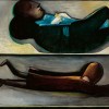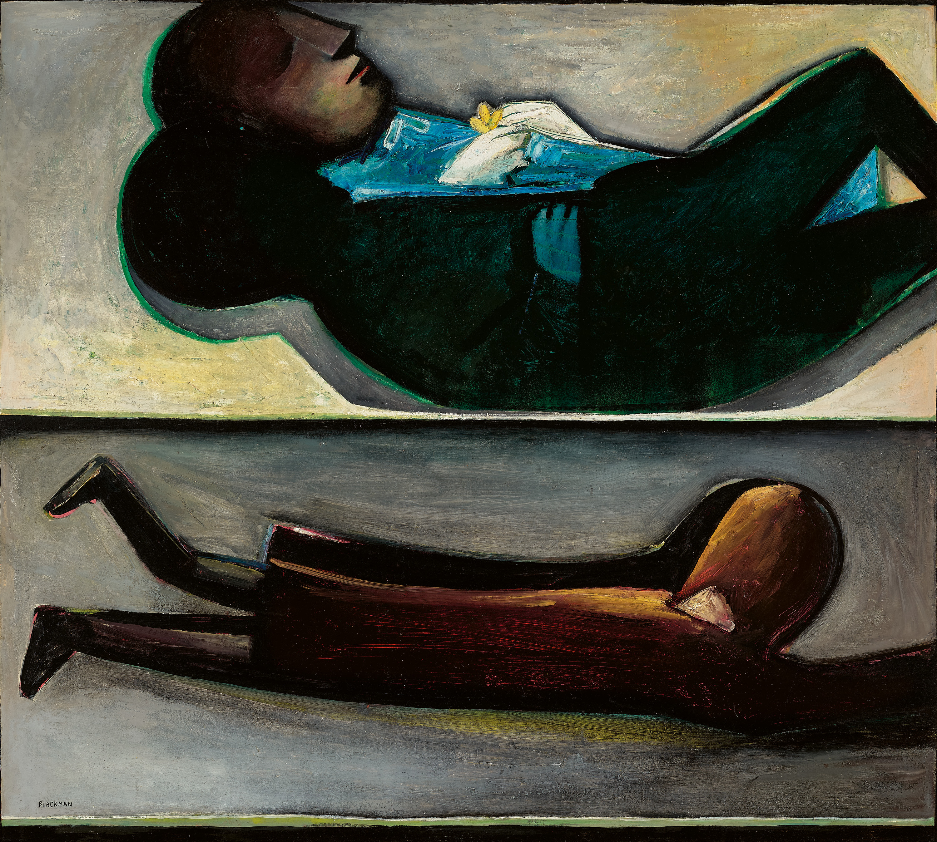 Possibly with the present work in mind, Robertson continued: ‘…Perhaps the dense blacks refer to the discrepancy between innocence and experience, making a further parallel with the tension between the idea and its projection, its shape and surface. We are given a curious impression, often of a double image, positive and negative, as well as of the space between people…’4 As reiterated by art historian David Hansen, a dominant feature and recurrent motif of Blackman’s art, is precisely that of the ‘double image’ encapsulated so powerfully here. From the head-spinning Star Gazer, 1955 to the Through the Looking Glass and Janus-faced Alice with Teapot Crown, 1956; the matching arm gestures of Waiting, 1961 or the dual figures of the iconic Dreaming in the Street, 1960 (National Gallery of Victoria) where one is depicted in bright light and full colour, and her companion reduced to a dark, anonymous silhouette.5 Separated into two voyeuristic vignettes akin to a split-screen ‘suite’, it is difficult to know whether Double Image accordingly represents two separate people or one and her shadow (psychological or emotional, rather than physical). Imbued with an aching sense of isolation and betraying an almost existential quality, indeed, it is perhaps not a coincidence that Blackman was reading Danish philosopher Soren Kierkegaard’s Either/Or (1843) at the time – a theory of human existence characterised by the enduring opposition between the essentially hedonistic-aesthetic heart and the critical-ethical mind.6 Such would also seem to accord with Robertson’s contemporary interpretation of the duality inherent in these poignant ‘double Image’ works, ‘…the paintings show their own synthesis, supercharged between romantic vision and classical compression of form.’7