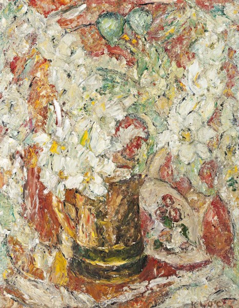 The rich red background of A Dream of Persia recalls the powerful tempera paintings O’Connor executed in the late 1920s, as does the sharp delineation of the individual objects. There are also echoes of the treatment the artist utilised in The Algerian Hat (lot 35), through the fracturing of the background plane and the potential dissolving of the flowers’ petals. These aspects, combined with the radiant light and the bold, palette knife application of the paint, point to this being executed shorty after her return to Australia in 1948, possibly to make up for the forced destruction of 150 paintings courtesy of the Fremantle Customs officials. The use of the word ‘dream’ in the title also hints at it being a form of memento mori, created in an attempt to capture the memory of happier days in Paris.