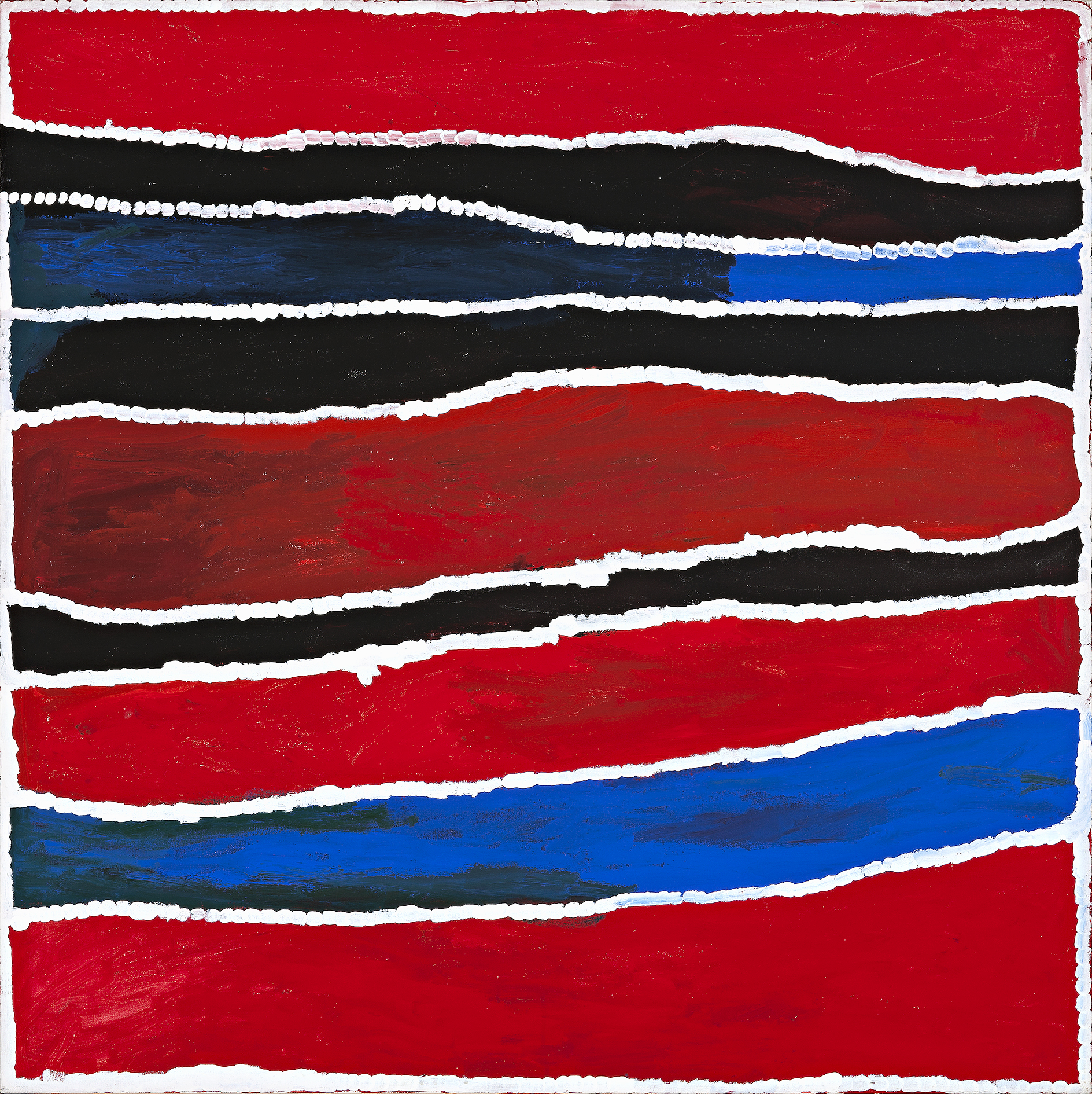 This painting is accompanied by a certificate of authenticity from Mangkaja Arts that states: ‘Her dreaming (Dagu) her country. The waterhole is the place where she grew up.’