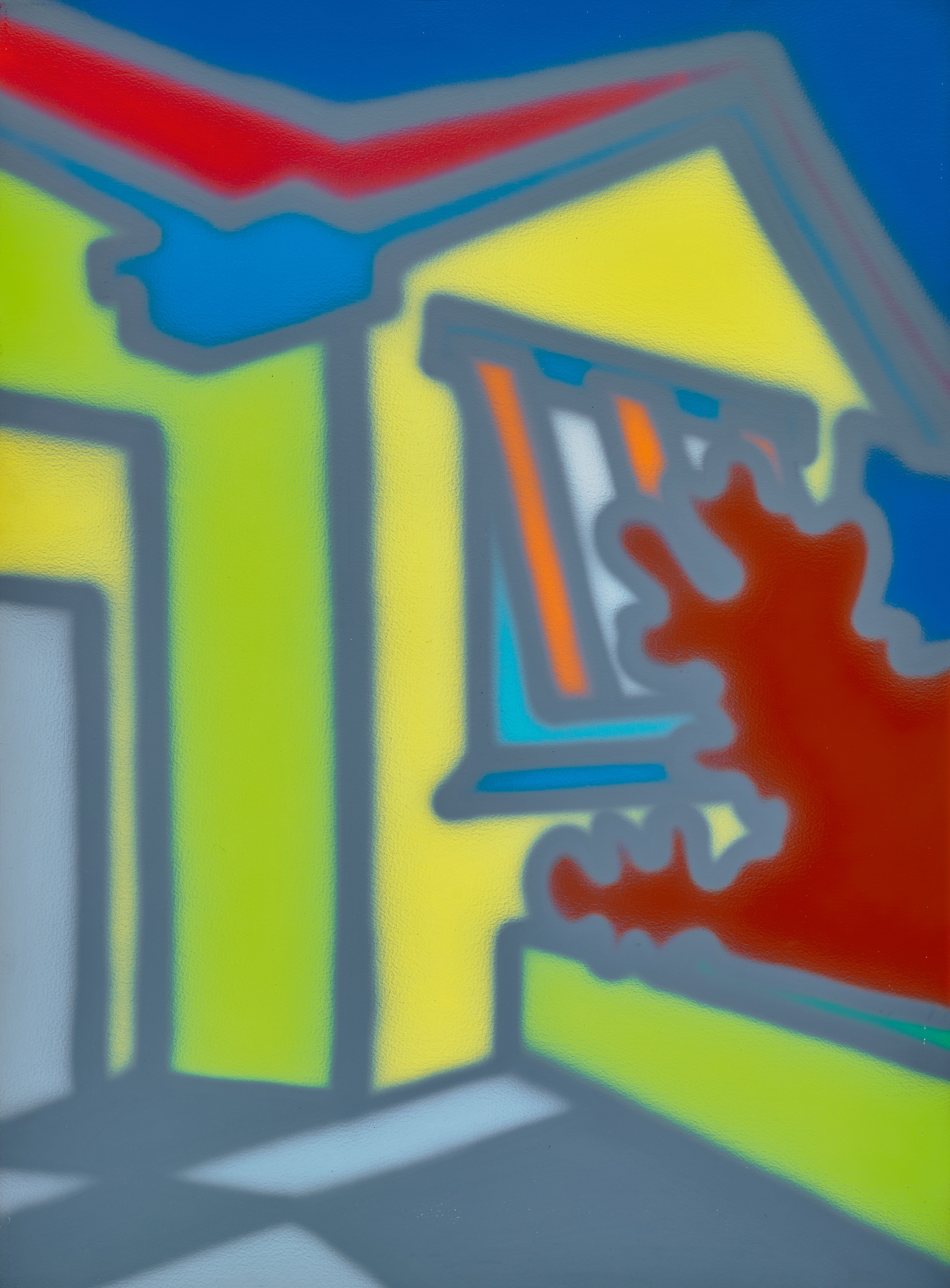 Although he dabbled in abstraction and tackled other subject matter, from freeways to shadow factories, it is the suburban home that remains Howard Arkley’s singular legacy. He was obsessed with capturing his immediate environs, no matter how mundane his apparent source material. Using an airbrush, Arkley created individual scenes of homes and their interiors utilising psychedelic colours and outlining suggestive of graffiti. The vivid, implausible hues of his palette and the tell-tale out of focus black outlines, hark back to the fetishism of custom painting and yet also heavily allude to street art vandalism. Both streams take the everyday object and amplify and distort it thus elevating it to a cult like status. Dull Home, 1998 captures the appeal of Arkley’s oeuvre succinctly.